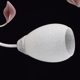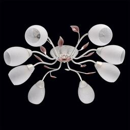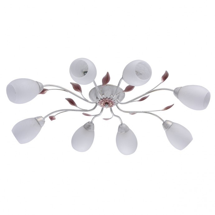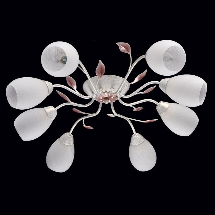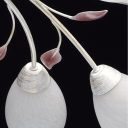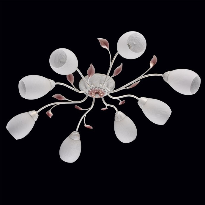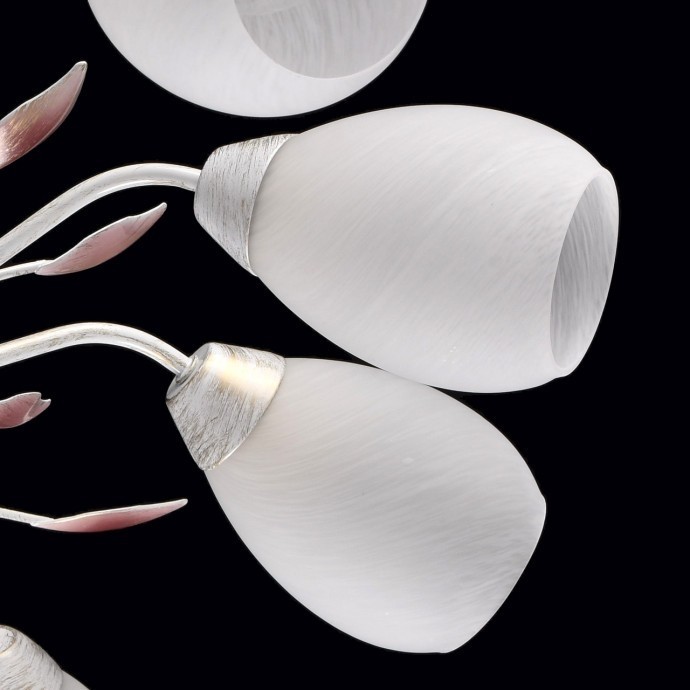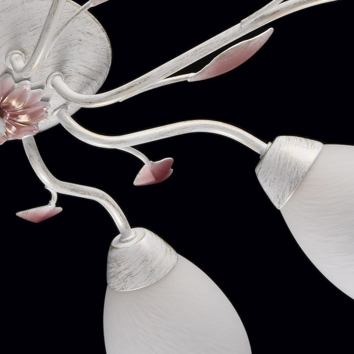 Основание: металл, окрашивание по технологии хай-лайт, основной цвет - белый, декоративный слой цвета золота. Рожки выполнены прокатом на роликовом станке. Декор: растительные элементы из металла, выполнены по технологии прессования, градуировано окрашены в розовый цвет. Плафоны: алебастровое стекло, матирование.