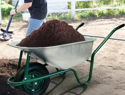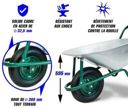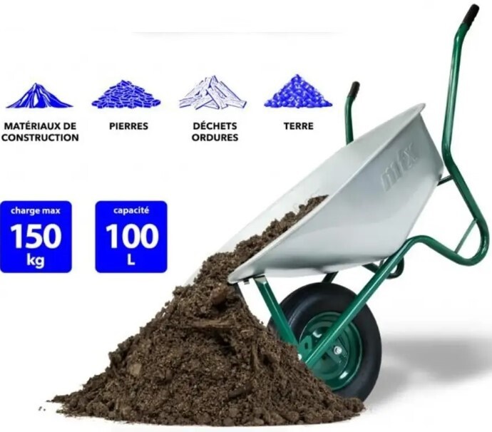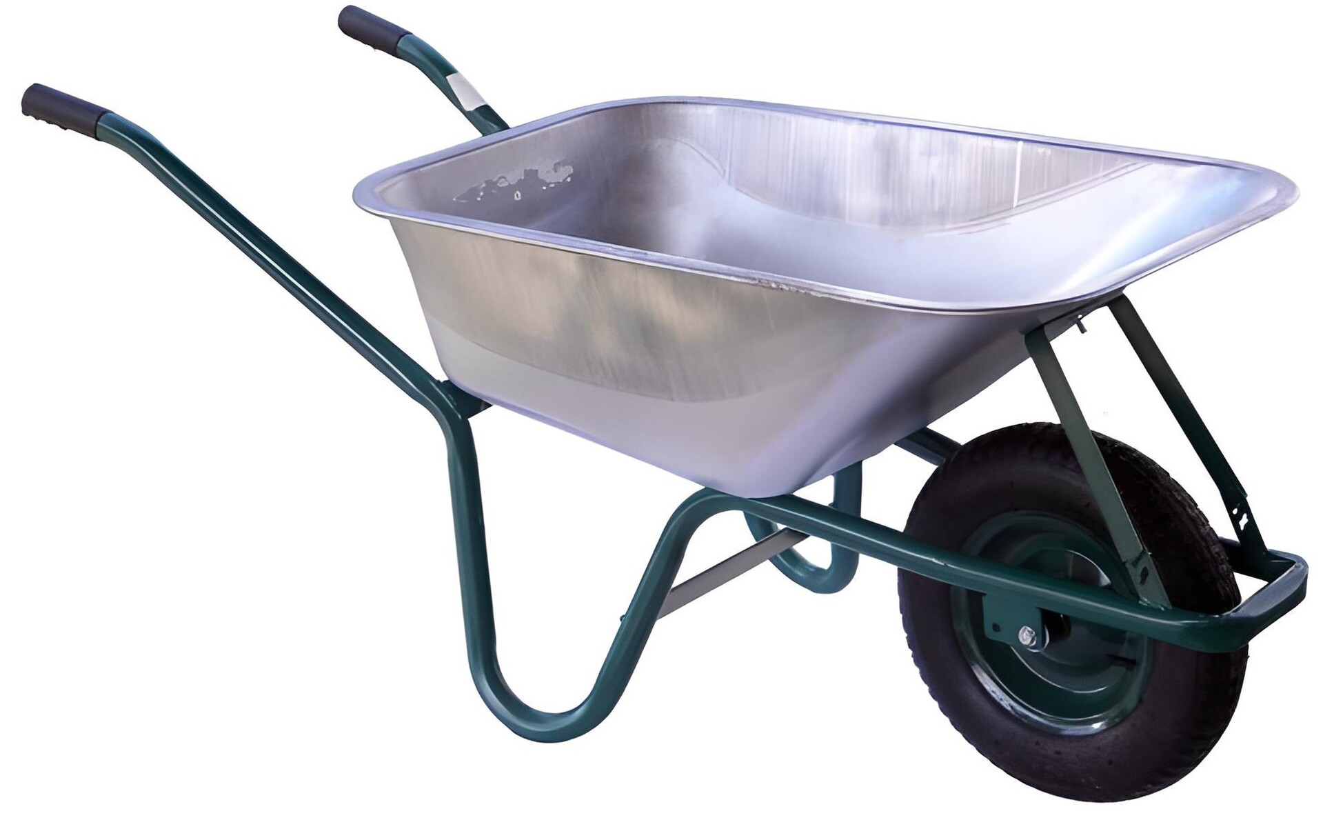строительная тачка с одним колесом, с кузовом из оцинкованной стали, объем 100 литров, максимальный вес груза - 150 кг;