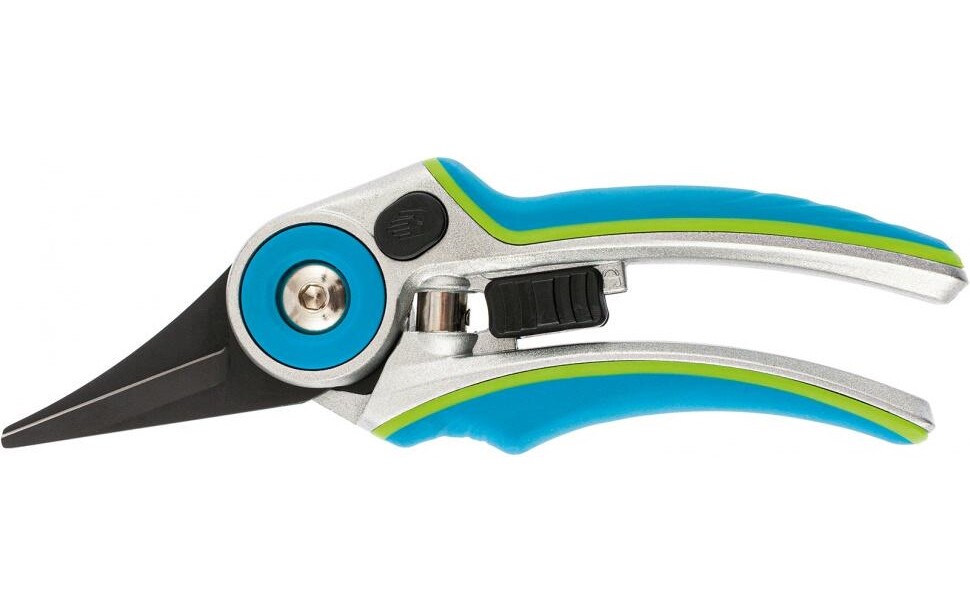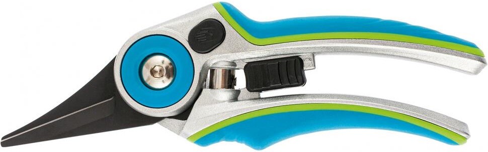 механический секатор для обрезания молодых отростков, стебельков, с рукоятками из алюминия, с настройкой ширины захвата;