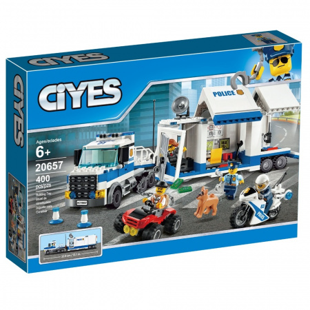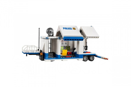 Подробная модель мобильного командного пункта полицейских станет отличным приобретением для любого поклонника соответствующей тематики. Она интересна тем, что представляет собой мощное транспортное средство и одновременно служебный офис с камерой предварительного заключения «на колёсах». Вся конструкция построена на транспортировочной платформе длинного тягача. Спереди у него кабина довольно крупного размера с голубоватым ветровым стеклом. Она хорошо оборудована – есть боковые зеркала, сигнальные огни, капот дополнительно усилен.