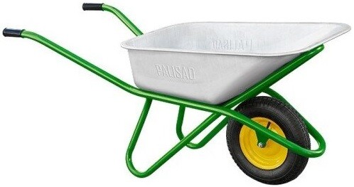 садово-строительная тачка с одним колесом, с кузовом из прочной оцинкованной стали, объемом 90 литров и максимально допустимым весом нагрузки в 200 кг;