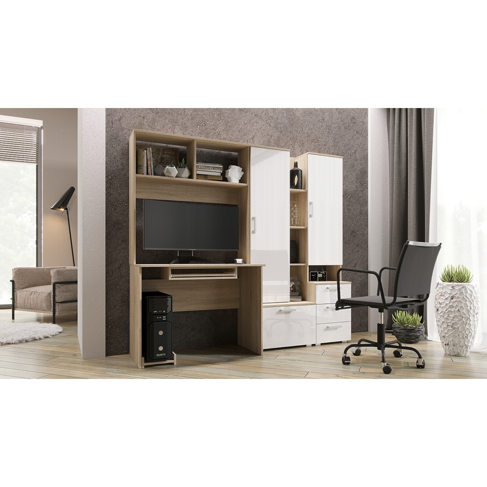 Стол компьютерный №6-1, 2000х538х1796, Дуб сонома/Белый глянец