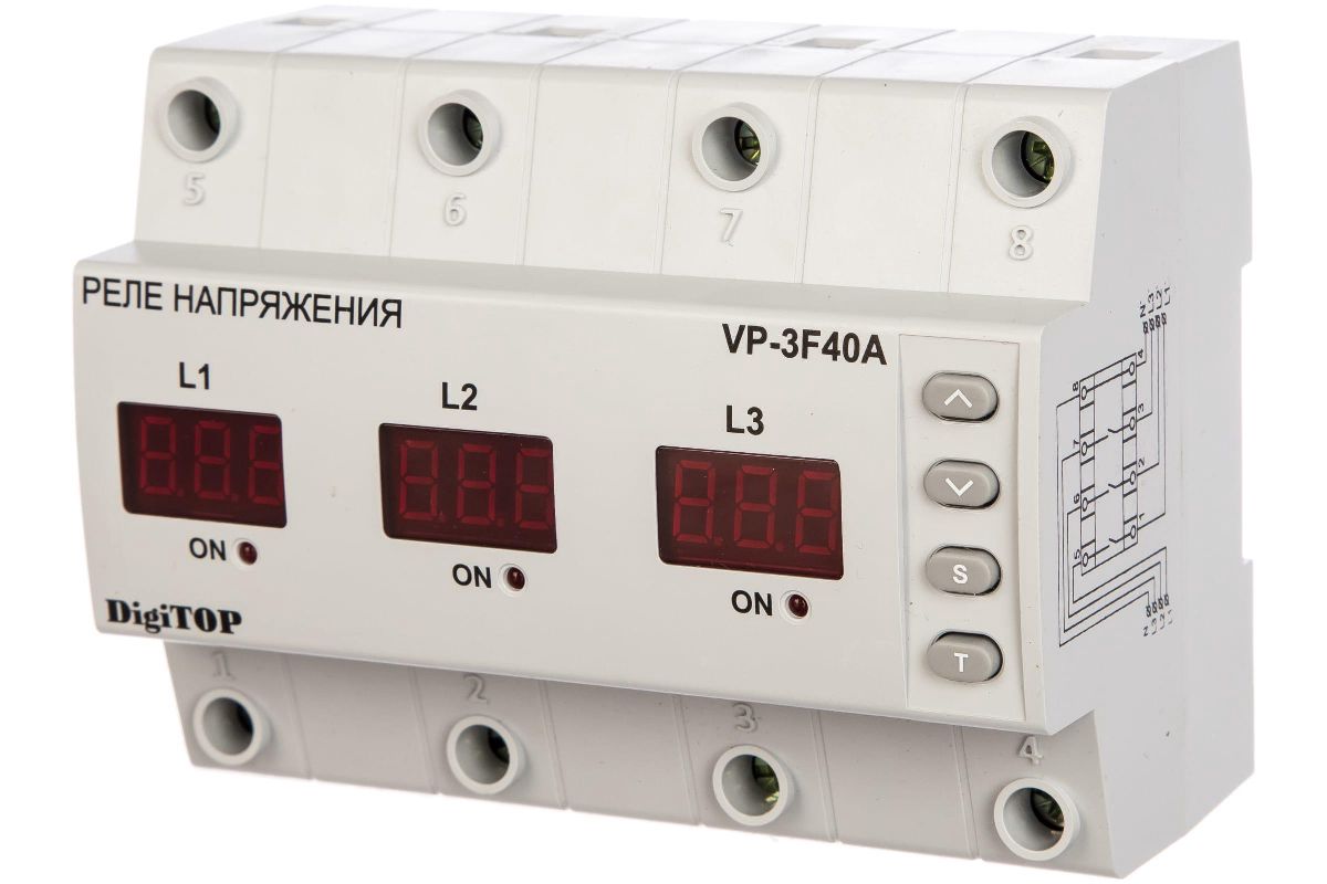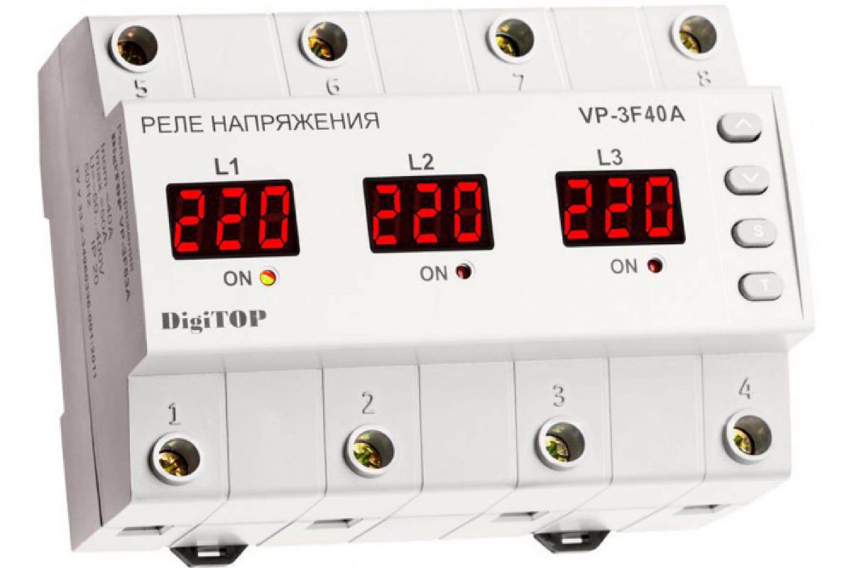 Реле напряжения DigiTOP Vp-3F40A используется для защиты от перепадов напряжения в одно- или трехфазном оборудовании.