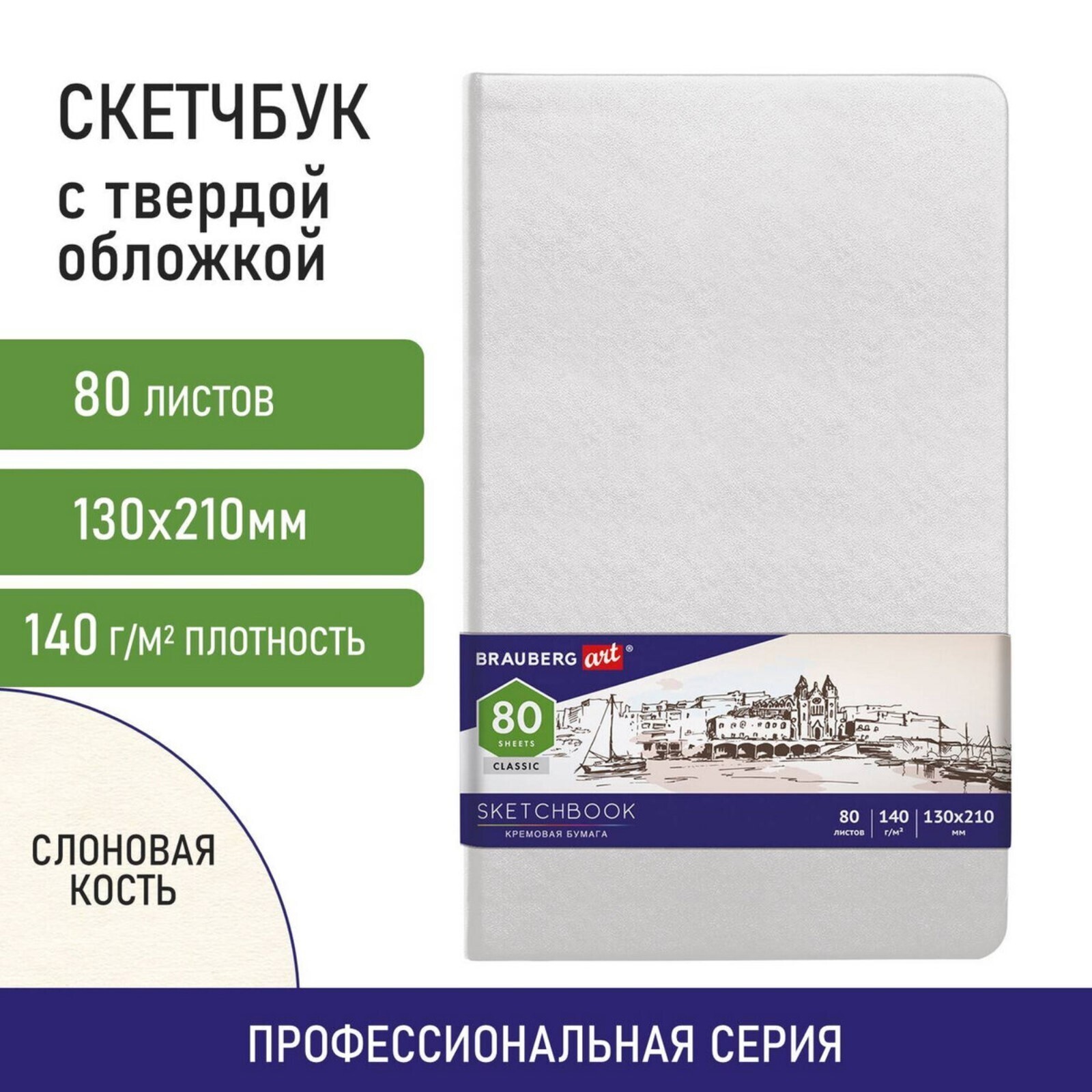 Скетчбук, слоновая кость 140 г/м2 130х210 мм, 80 л., КОЖЗАМ, резинка, BRAUBERG ART CLASSIC, белый, 1