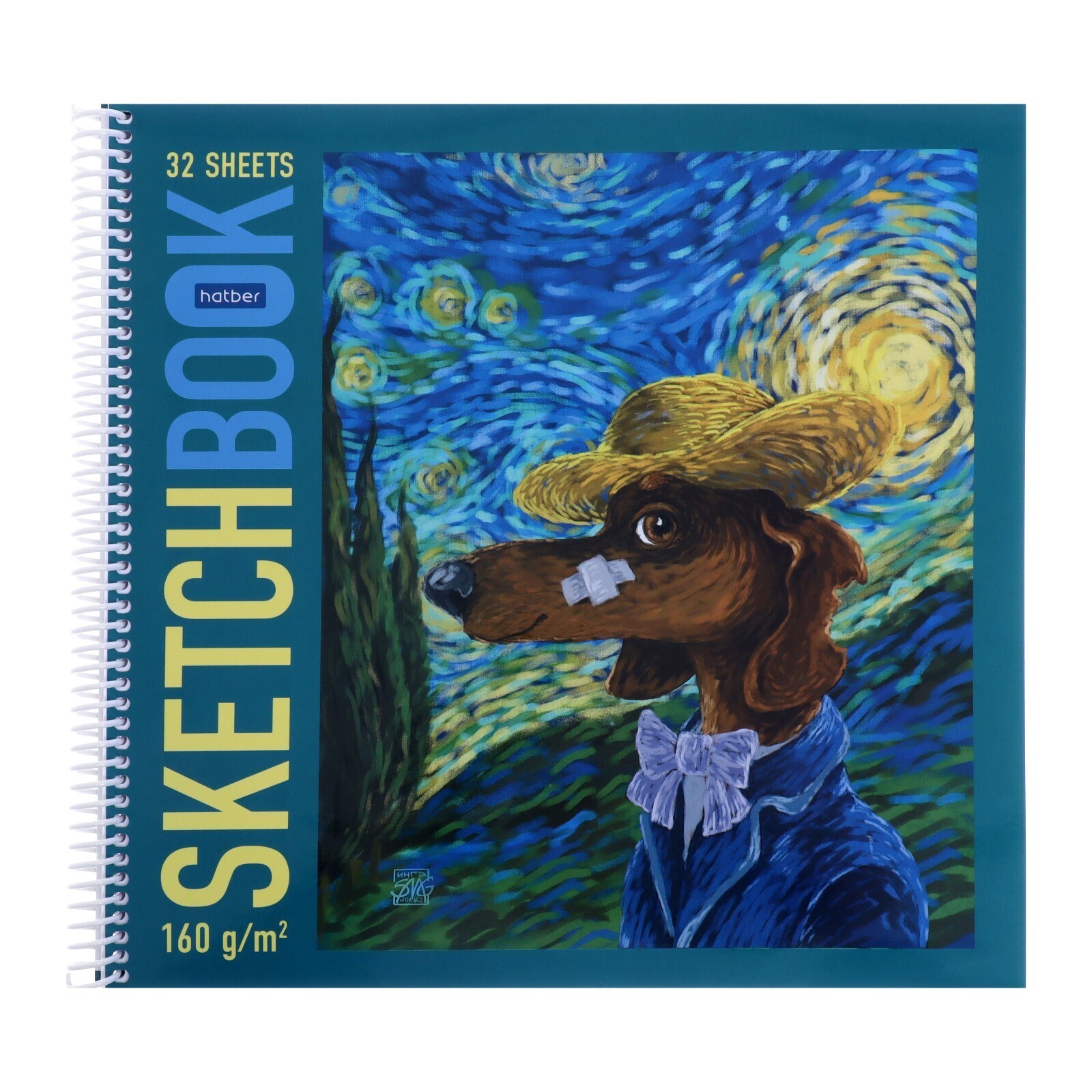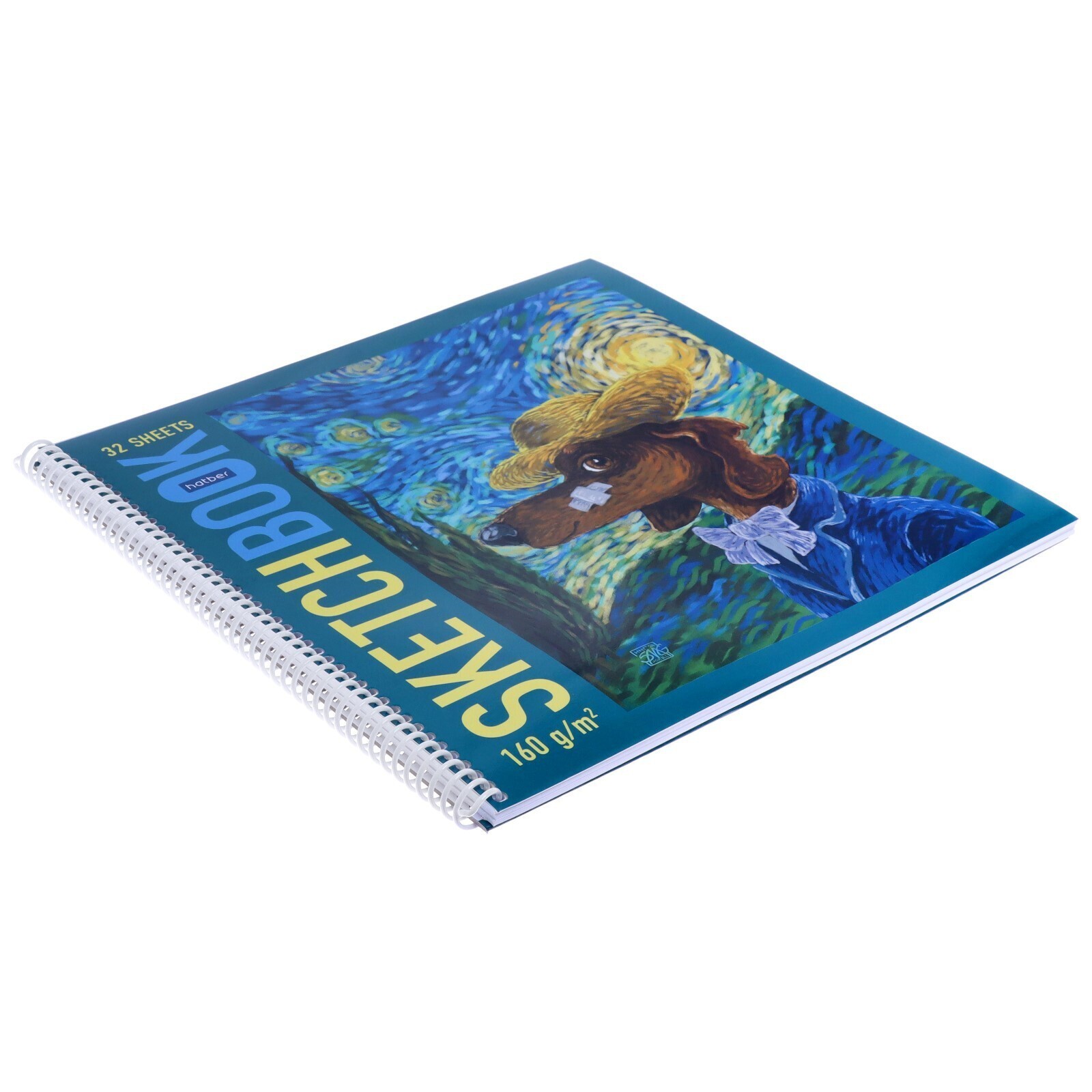 Тетрадь-скетчбук 290х290 мм, 32 листа на гребне "Такса-Ван Гог", обложка мелованный картон, глянцевая ламинация, блок 160 г/м², с пошаговыми эскизами