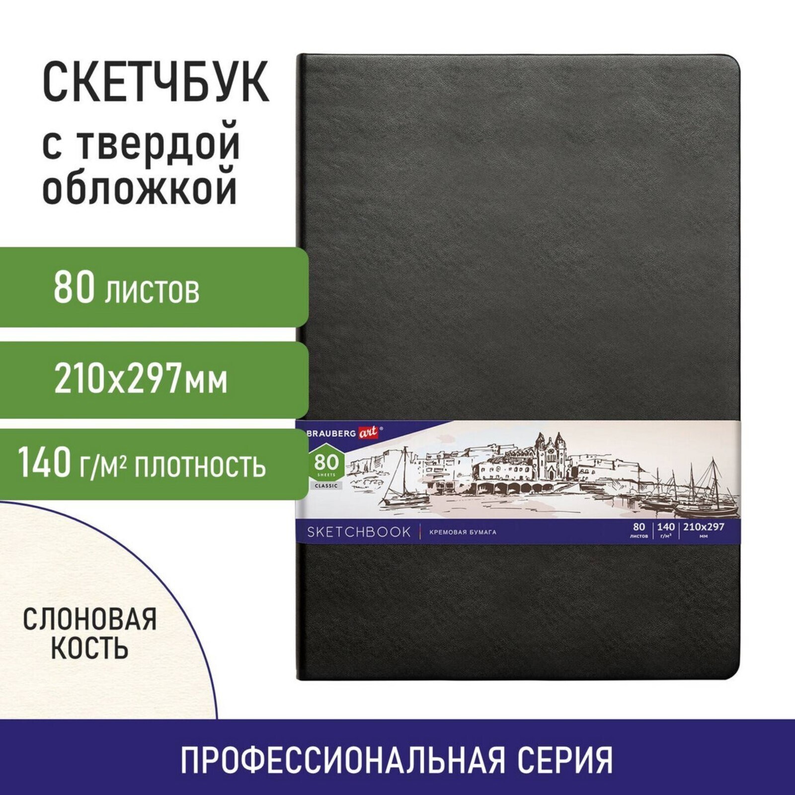 Скетчбук, слоновая кость 140 г/м2 210х297 мм, 80 л., КОЖЗАМ, резинка, BRAUBERG ART CLASSIC, черный,
