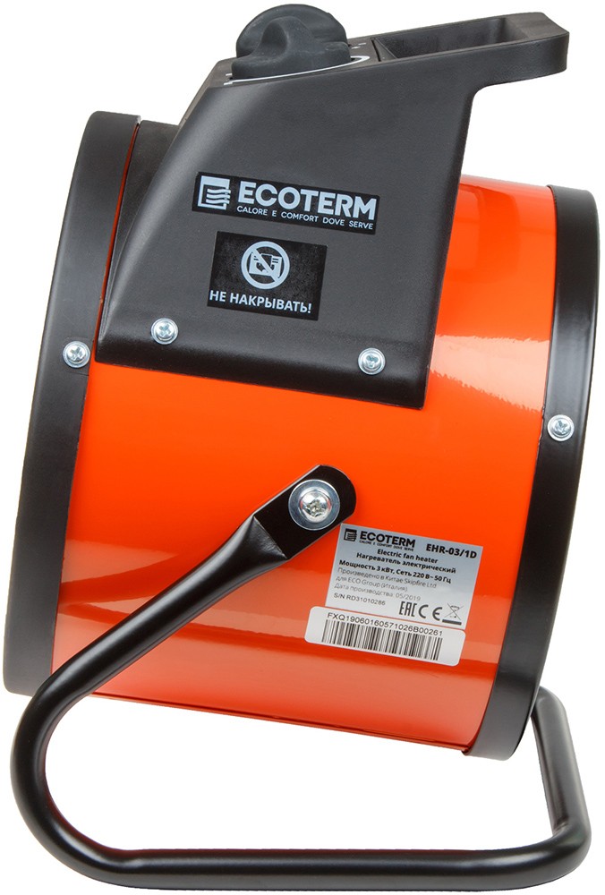 Пушка тепловая электрическая ECOTERM EHR-03/1D применима в бытовых электрических сетях. Высококачественные керамические ТЭНЫ с повышенным ресурсом работы. Двухступенчатый регулятор тепловой мощности. Регулируемый температурный термостат. Может использоваться в качестве вентилятора без обогрева. Прочный стальной корпус.
