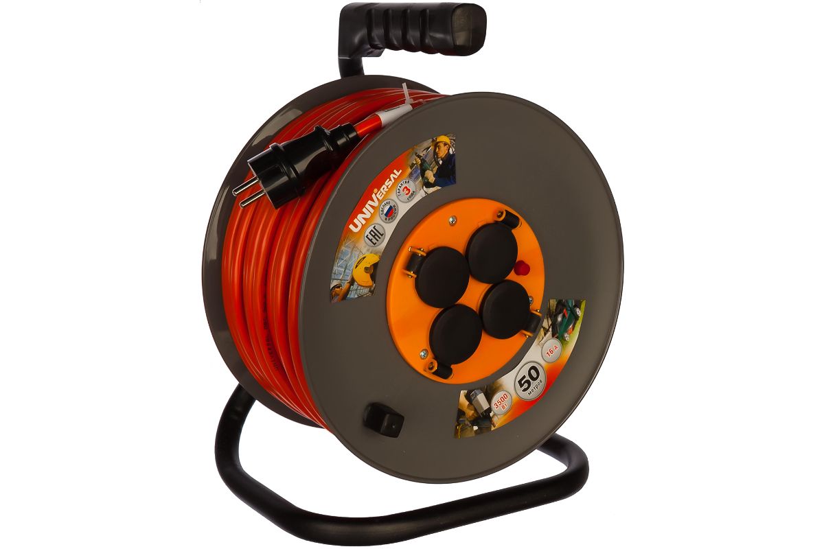 Удлинитель на катушке 4х50м ВЕМ-250 т/защ. ПВС3х2.5 IP44 Universal предназначен для обеспечения подключения электрических приборов и инструмента на удалении от стационарной розетки максимум до 50 метров.