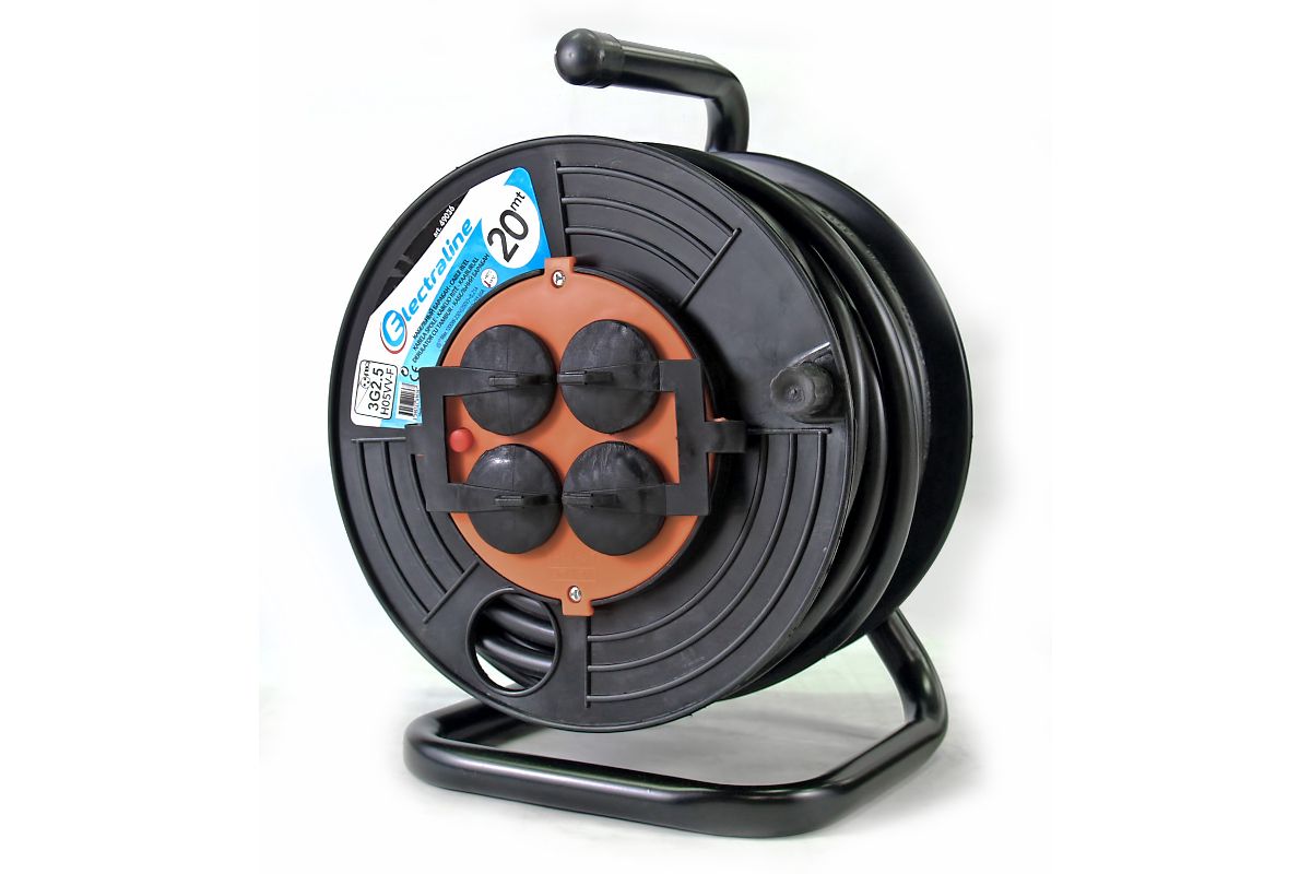 Профессиональный удлинитель на катушке с защитой от перегрузки, оснащен четырьмя розетками и предназначен для удаленной работы с электрическими приборами. Состоит из пластиковой катушки на треноге и провода.