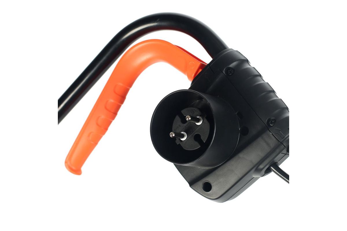 Предотвращает вырывание вилки при случайном застревании шнура. Позволяет хранить кабель прямо на газонокосилке.