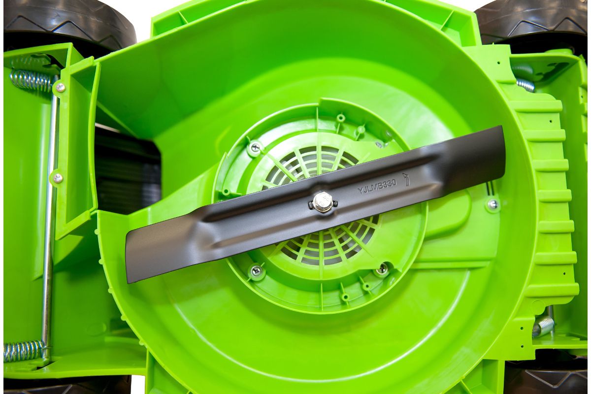 Мощность 1200 Вт – газонокосилка легко переносит высокие нагрузки и не перегревается.
