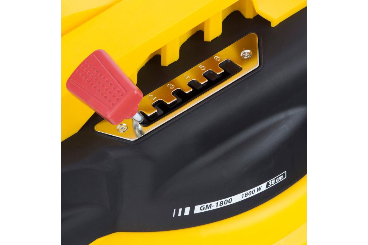 Высота подреза травы регулируется на шести уровнях 20/30/40/50/60/70 мм с помощью рычага, расположенного на корпусе.
