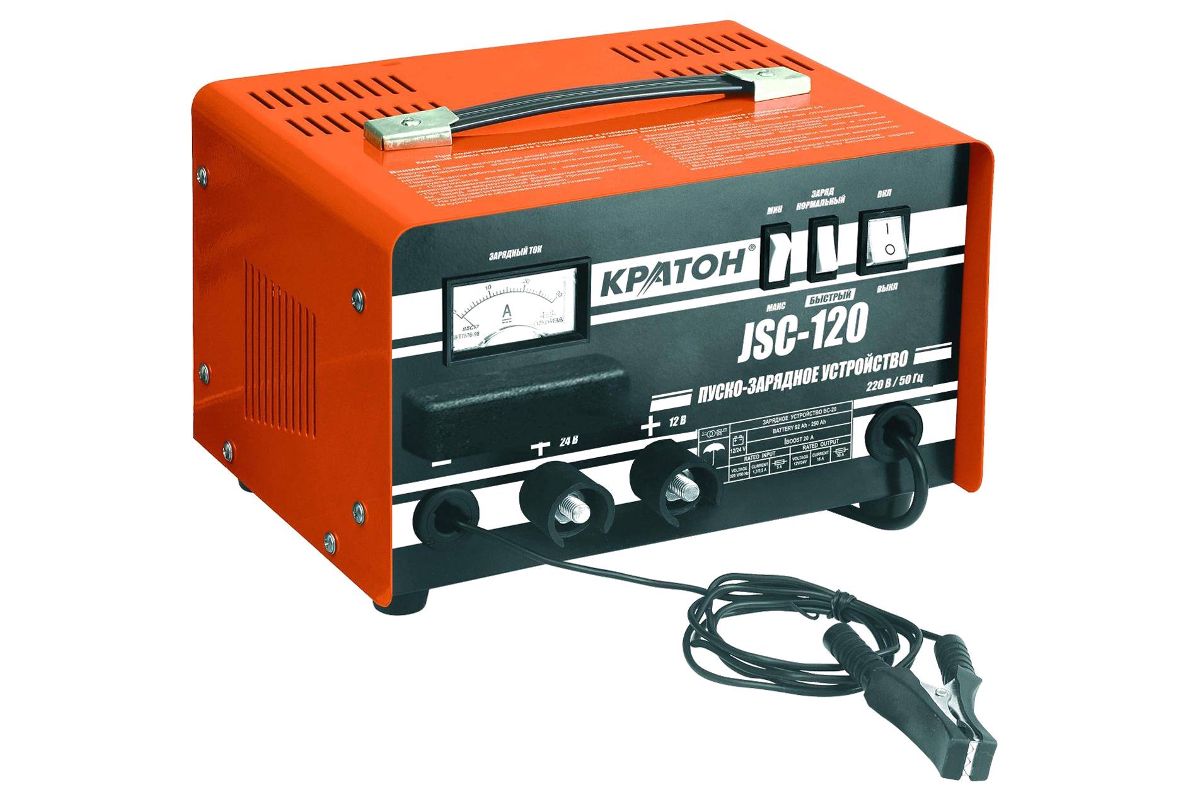 КРАТОН JSC-120 — переносное пуско-зарядное устройство. Используется в быту для подзарядки аккумулятора автомобиля и запуска двигателя. Максимальный пусковой ток — 30А. Выходной ток заряда — 20А. Напряжение батарей — 12/24 Вольт.