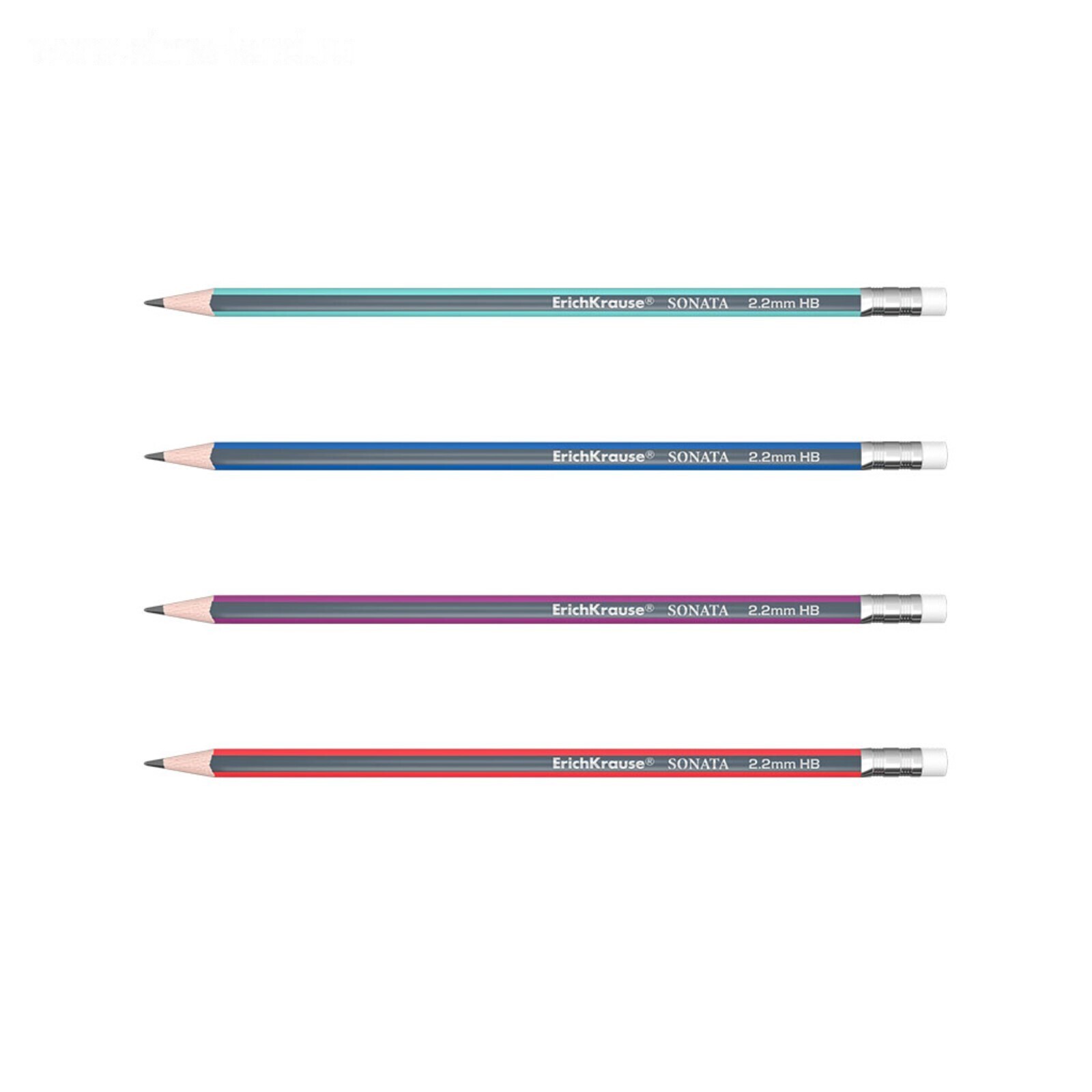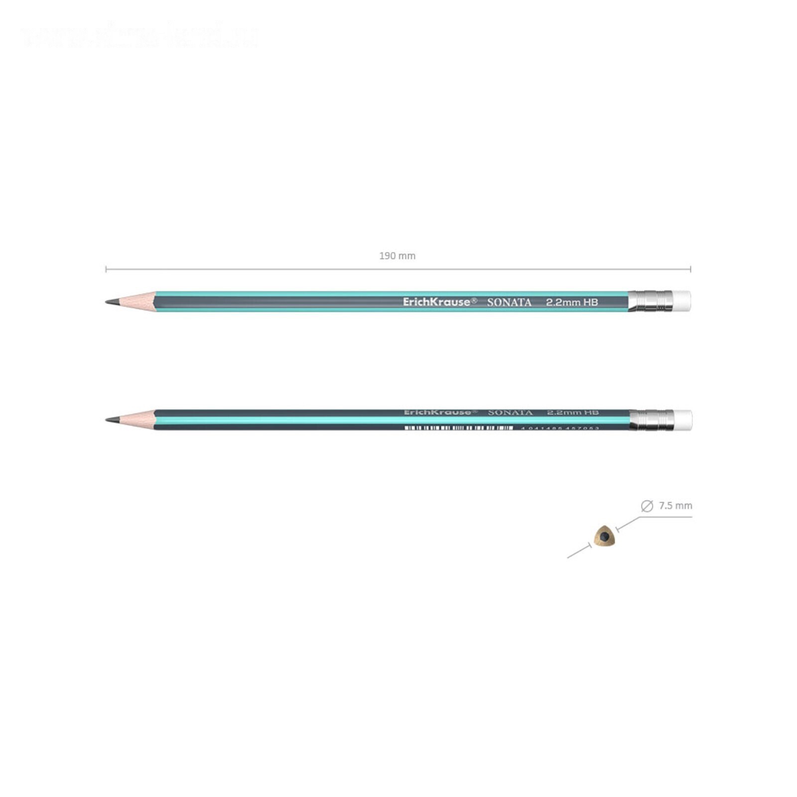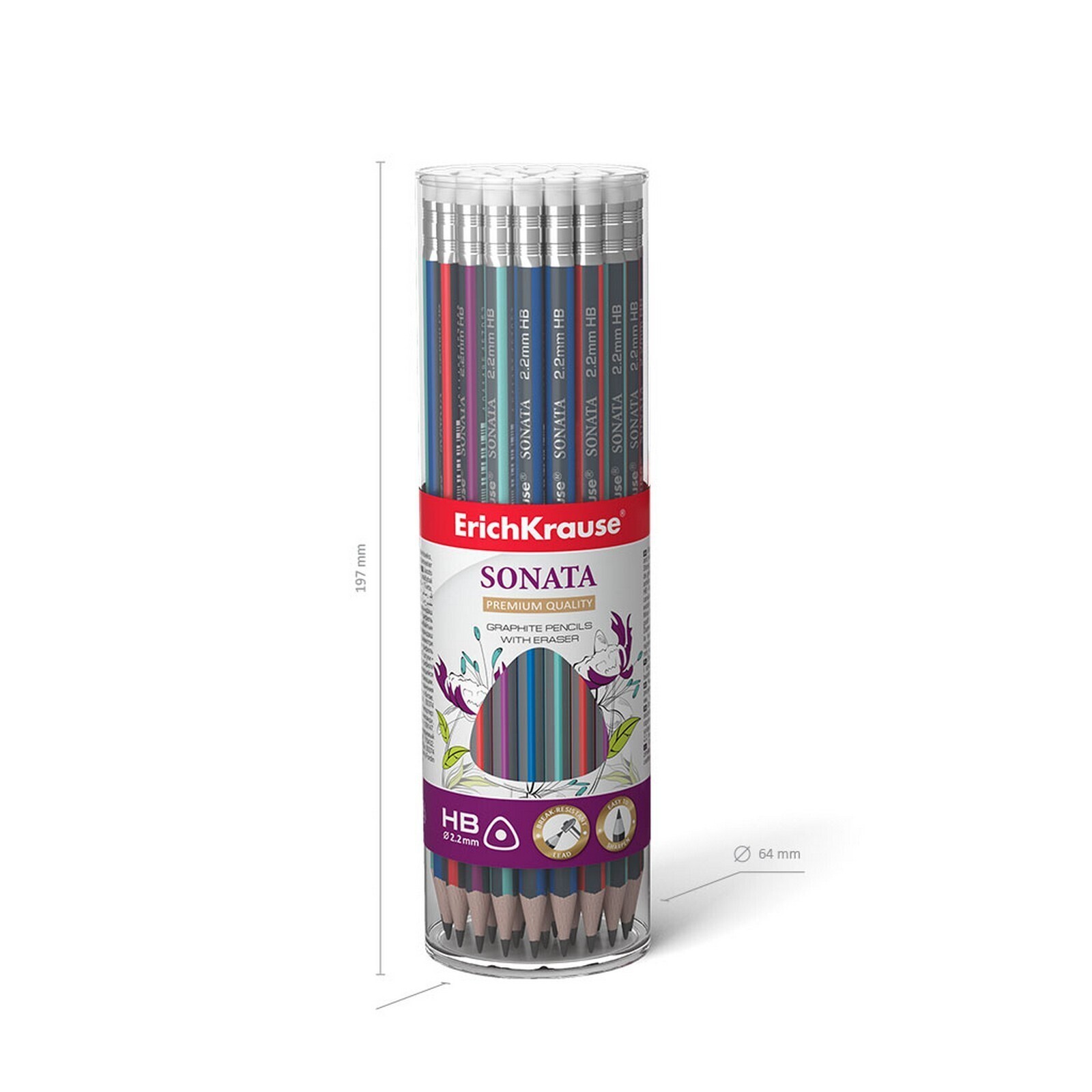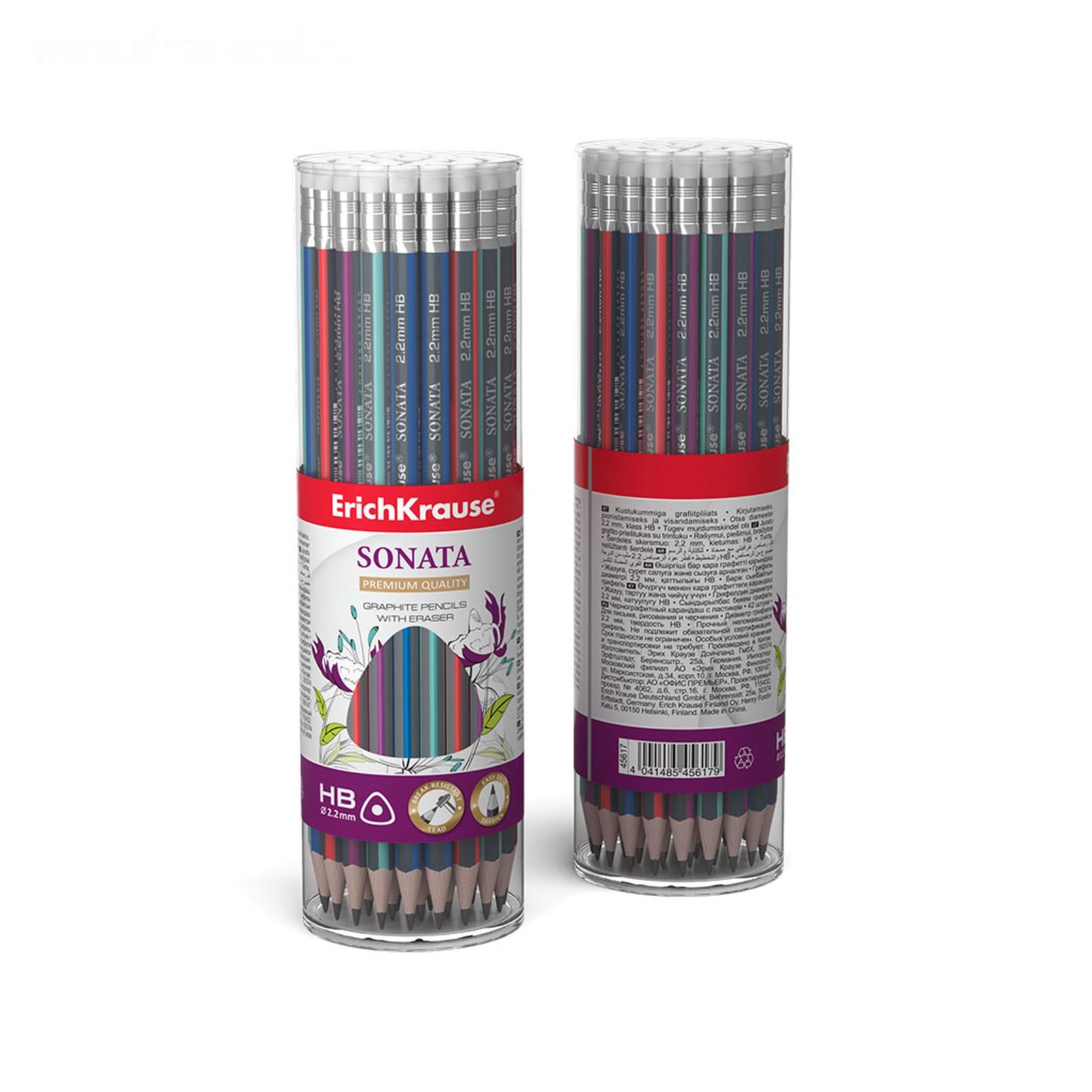 Карандаш чернографитный НВ, 2.2 мм, ErichKrause Sonata, трёхгранный, из отборной древесиныс ластиком, в тубусе, микс