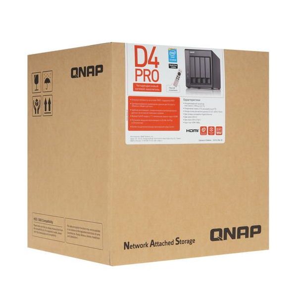 Сетевое хранилище (NAS) QNAP D4 Pro (Rev. B) предлагает 4 отсека для размещения накопителей форм-фактора 3.5 или 2.5, каждый из которых может иметь вместимость до 16 ТБ. Если вам необходимо устройство для долговременного хранения программ, документов и мультимедиа, способное обеспечивать к ним доступ из любого места через Интернет, данная модель станет удачным выбором. Быструю обработку запросов в сетевом хранилище обеспечивают процессор Intel Celeron J1900 и оперативная память объемом 2 Гб. При необходимости вместимость ОЗУ можно увеличить до 8 Гб. Сетевое хранилище (NAS) QNAP D4 Pro (Rev. B) с возможностью дистанционного управления через телефон или планшет оснащается парой гигабитных Ethernet-разъемов. Вместе с устройством поставляются винты для крепления дисков, инструкция, кабель Ethernet и кабель питания, а также пульт ДУ.