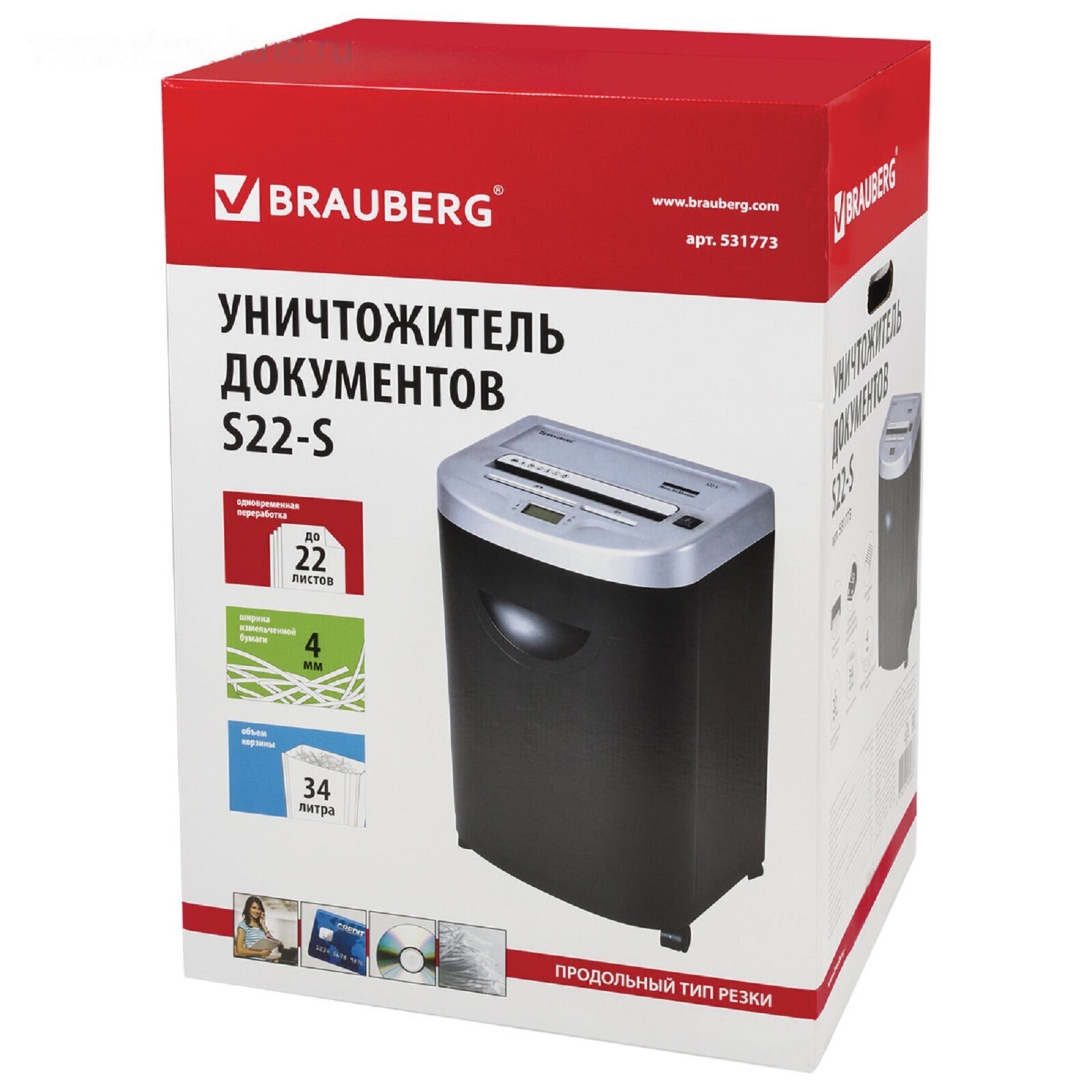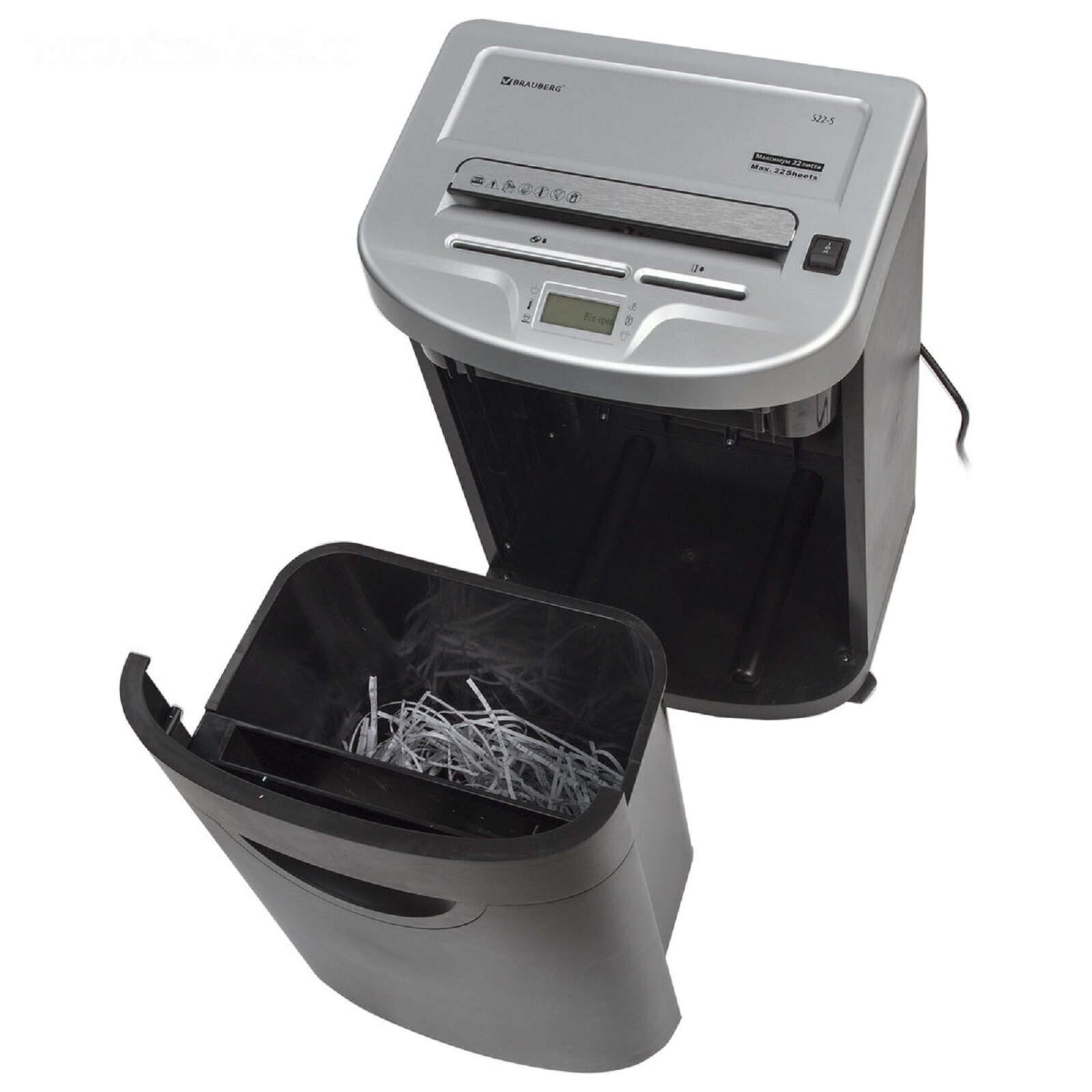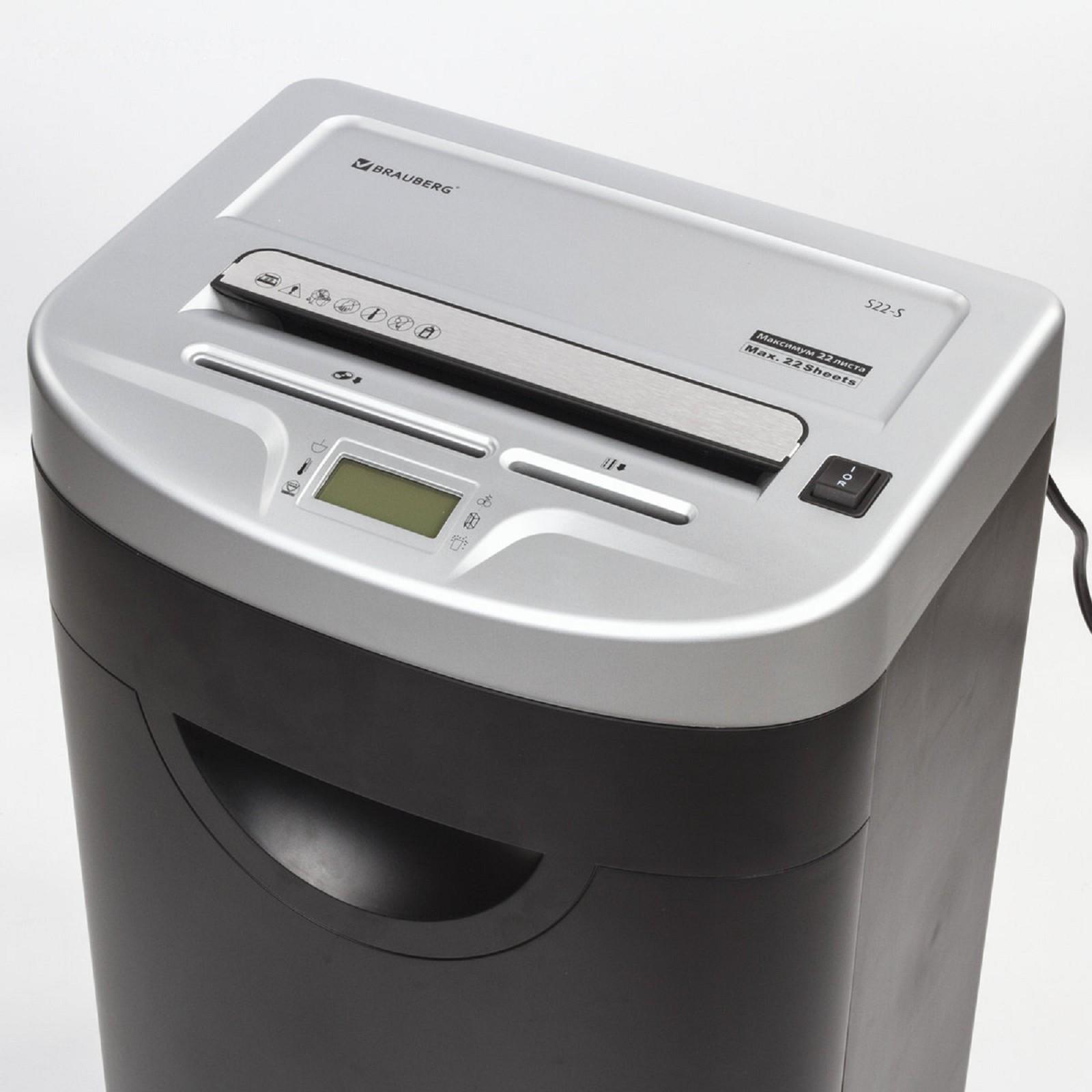 Шредер BRAUBERG S22-S (Р-2), полоски 4 мм, 22 листа одновременно, скобы, пл.карты, CD, 35 л 486393