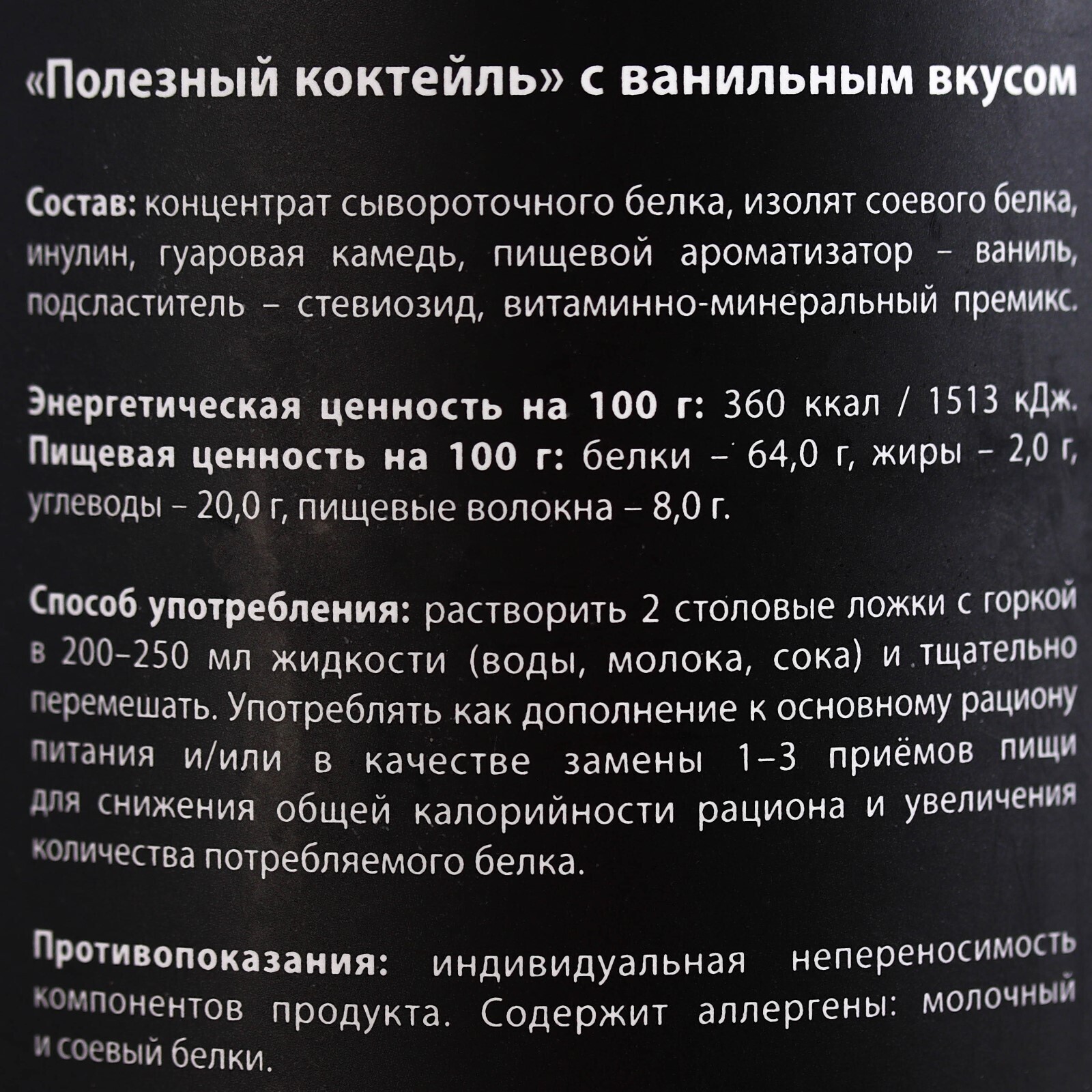 Способ употребления: растворить 2 столовые ложки с горкой в 200–250 мл жидкости (воды, молока, сока) и тщательно перемешать. Употреблять как дополнение к основному рациону питания и/или в качестве замены 1–3 приёмов пищи для снижения общей калорийности рациона и увеличения количества потребляемого белка.