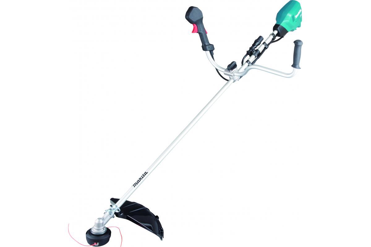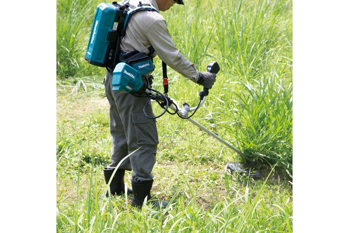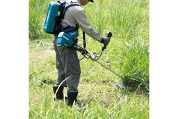 Аккумуляторный триммер позволяет поддерживать порядок на придомовой территории, приусадебном участке и т. п. Техническое устройство массой 5,4 кг через адаптер PDC01 питается от литий-ионных аккумуляторов 18+18 В, которые вместе с адаптером и зарядным не предусмотрены начальной комплектацией электрокосы. Бесщеточный двигатель развивает мощность 1000 Вт, что обеспечивает высокую производительность техники. Три рабочих скорости позволяют на холостом ходу производить от 0 до 4600/ 5500/ 7000 оборотов в минуту, соответственно. В качестве режущего элемента может использоваться леска, обеспечивающая ширину скашивания 430 мм, а также двухлопастный нож диаметром 255 мм.