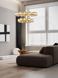 Эффектная люстра в золотом цвете с прозрачными плафонами подойдет для пространств с квадратурой 35 кв.м. Плавные линии и округлые формы дарят чувство спокойствия, а блеск золота переливается на солнце, создавая приятные блики. Эта модель будет радовать вас своим присутствием в комнате даже если вы не включаете свет.