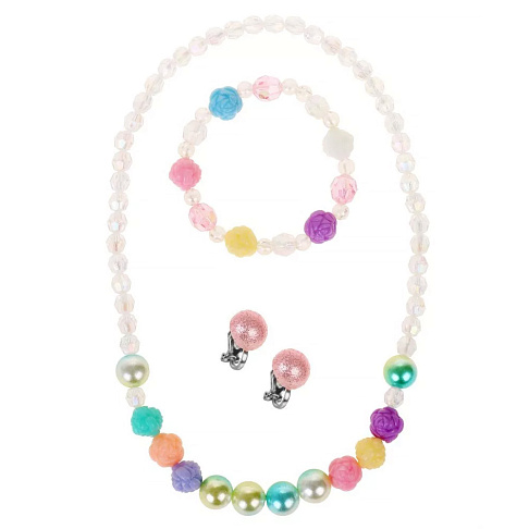 В комплекте: бусы, браслет и клипсы. Украшения состоят из изящных бусин прозрачного, пудрово-розового, голубого, сиреневого, жёлтого и бирюзового цвета. Бусинки имеют разную форму и размер.