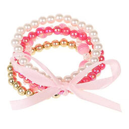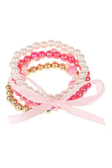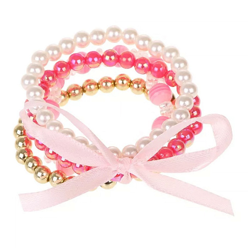 Браслет состоит из нескольких слоёв с бусинами золотистого, малинового, перламутрово-белого, прозрачного и нежно-розового цвета. Слои подвязаны атласной нежно-розовой лентой.