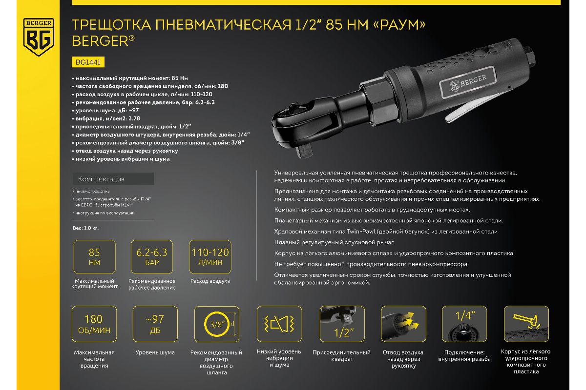 ТРЕЩОТКА ПНЕВМАТИЧЕСКАЯ 1/2 «РАУМ» BERGER BG1441 – универсальная усиленная пневматическая трещотка профессионального качества, надёжная и комфортная в работе, простая и нетребовательная в обслуживании.