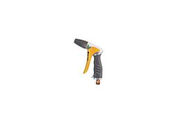 Пистолет-распылитель со штуцерной посадкой и удобным курком, расположенным спереди. Оснащен регулируемой форсункой, что обеспечивает три режима полива: жесткую струю, распыление типа «туман», конусное распыление. Имеет фиксатор курка для непрерывной работы.