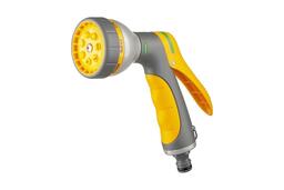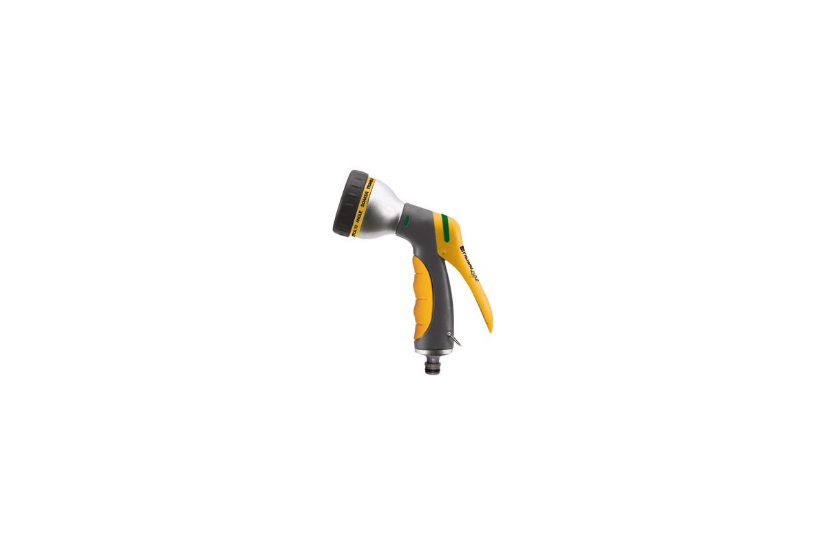 Пистолет-распылитель со штуцерной посадкой и удобным курком, расположенным сзади. Оснащен регулируемой форсункой, что обеспечивает семь режимов полива: двойную плоско-вертикальную струю, жесткую струю, сочащийся режим, двойную плоско-горизонтальную струю, душ, распыление типа «туман», конусное распыление. Имеет фиксатор курка для непрерывной работы.