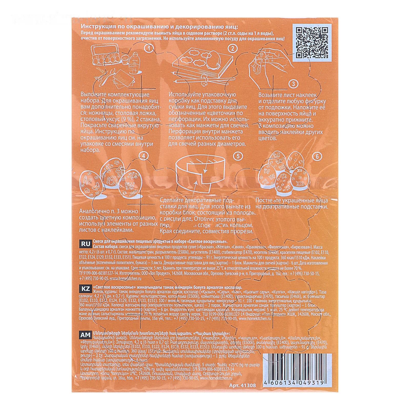 В данном наборе вы найдёте не только пищевые красители шести оттенков. Также в комплекте целых три листа цветных объемных наклеек, подставки для яиц и свечей.