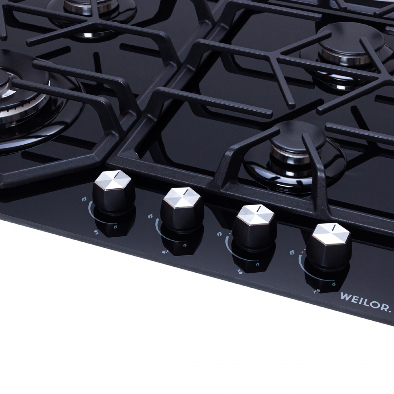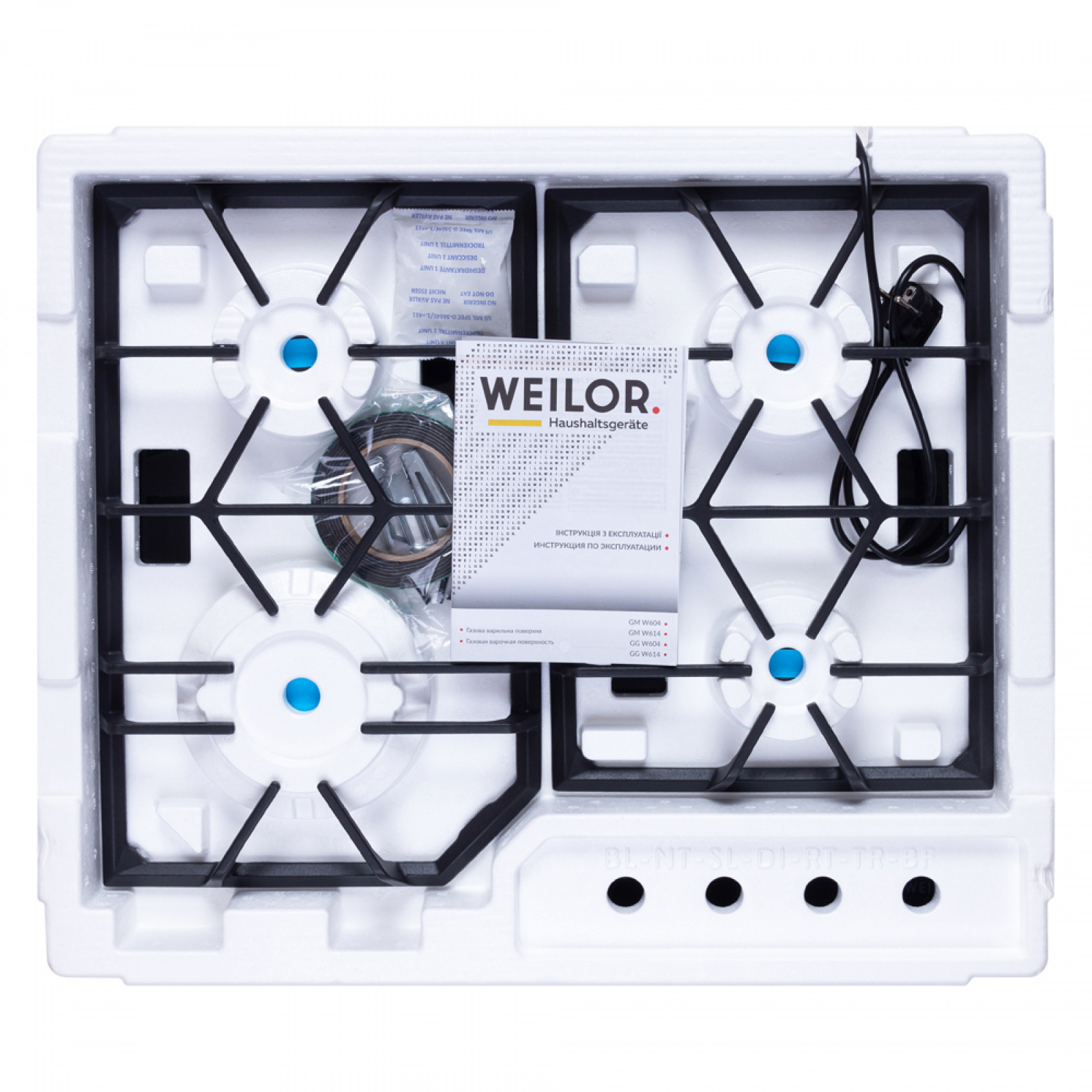 Weilor — запорука сучасного лаконічного дизайну вашої варильної поверхні! Геометрія решіток варильної поверхні, виготовлених із високоякісного чавуну, ідеально доповнить інтер'єр вашого кухонного приміщення. Ромбоподібні регулятори керування, виготовлені з термостійкого пластику, виготовлені з дотриманням єдиної стилістики дизайну поверхні. Функціональність техніки Weilor для забезпечення вашого комфорту! Автоматичний тип електропідпалювання, який спрацьовує одночасно з подаванням газу, у регуляторах керування поверхнею є найбільш комфортним і безпечним. Ми піклуємося про вашу безпеку! Варильні поверхні Weilor обладнані системою «газ-контроль», яка автоматично блокує подавання горючої речовини, якщо немає полум'я, та забезпечує максимальну безпеку використання приладу. Weilor — безкомпромісність у питаннях якості! Міцність загартованого скла вп'ятеро вища від стандартного, що забезпечує його стійкість до механічних впливів. Крім того, матеріал має високий ступінь термостійкості та здатний витримати перепади температури від -70 °C до 250 °C.