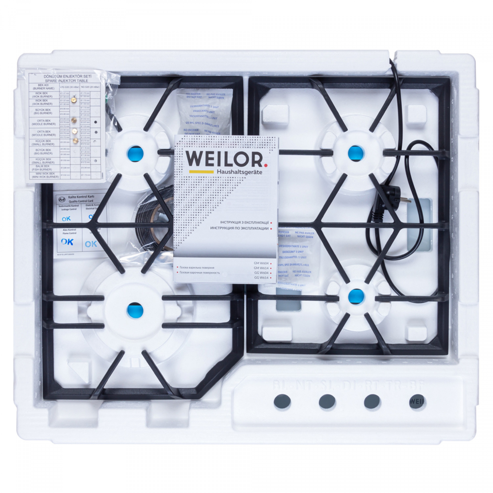 Weilor — запорука сучасного лаконічного дизайну вашої варильної поверхні! Геометрія решіток варильної поверхні, виготовлених із високоякісного чавуну, ідеально доповнить інтер'єр вашого кухонного приміщення. Ромбоподібні регулятори керування, виготовлені з термостійкого пластику, виготовлені з дотриманням єдиної стилістики дизайну поверхні. Функціональність техніки Weilor для забезпечення вашого комфорту! Автоматичний тип електропідпалювання, який спрацьовує одночасно з подаванням газу, у регуляторах керування поверхнею є найбільш комфортним і безпечним. Ми піклуємося про вашу безпеку! Варильні поверхні Weilor обладнані системою «газ-контроль», яка автоматично блокує подавання горючої речовини, якщо немає полум'я, та забезпечує максимальну безпеку використання приладу. Weilor — безкомпромісність у питаннях якості! Міцність загартованого скла вп'ятеро вища від стандартного, що забезпечує його стійкість до механічних впливів. Крім того, матеріал має високий ступінь термостійкості та здатний витримати перепади температури від -70 °C до 250 °C.