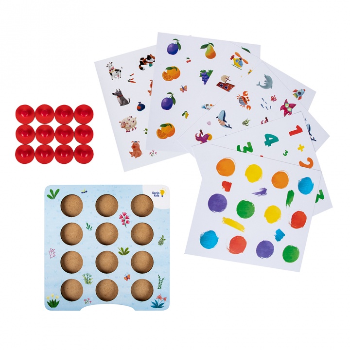 Игра Занимательное мемо включает 6 двусторонних карточек, с помощью которых легко познакомить ребенка с цифрами, названиями цветов, овощей и фруктов, названиями животных, геометрических фигур, видами транспорта. Игра способствует развитию памяти и пространственного мышления. Вставьте карточку в планшет, запомните расположение картинок, закройте картинки фишками, найдите парные картинки по памяти, открывая по две фишки.