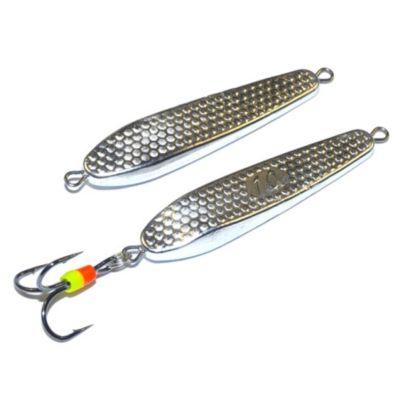 Блесны изготовлены из бинарного сплава серебра. Разработаны специально для ловли судака и крупного окуня со льда. Оснащены тройником с флуоресцентным кембриками серии ST-36 от фирмы "OWNER" № 8.