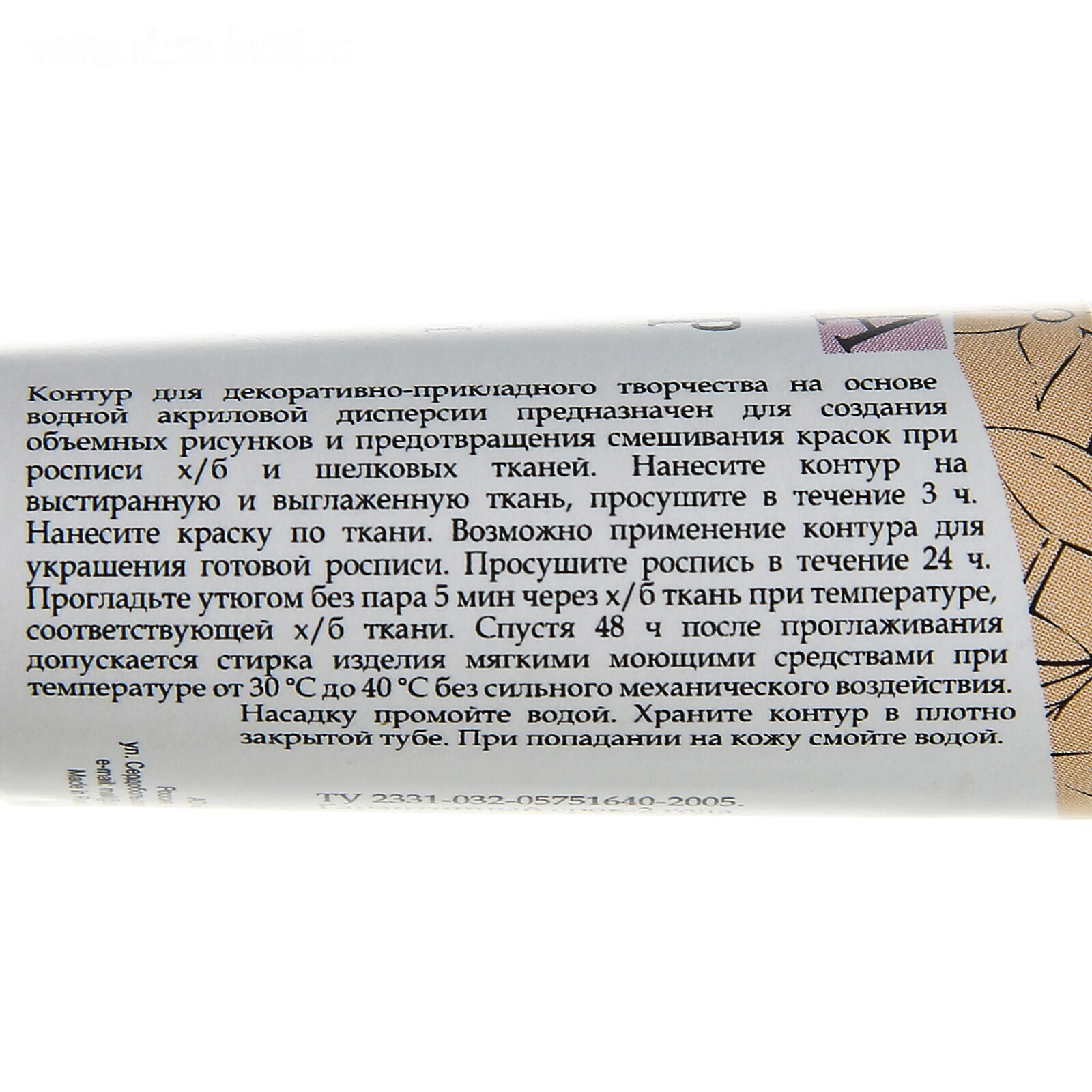 Контуры для декоративно-прикладного творчества на основе водной акриловой дисперсии предназначены для создания объемных рисунков и предотвращения смешивания красок при росписи х/б и шелковых тканей.