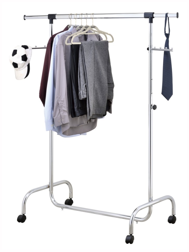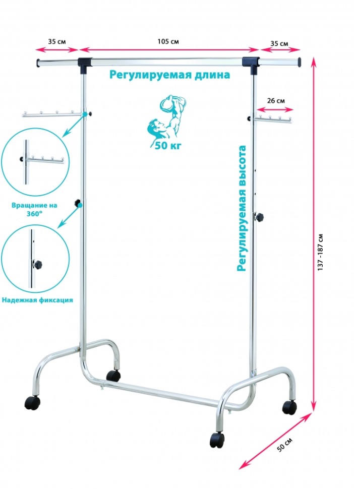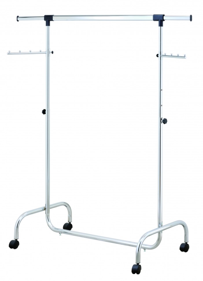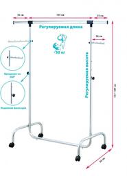 Заводская упаковка нарушена или отсутствует. Товар НОВЫЙ, в полной комплектации. / Стойка UniStor RINO для одежды усиленная, на колёсиках, с боковыми выдвижными планками и дополнительными планками для аксессуаров. Надёжная конструкция изготовлена из хромированной стали, быстрая сборка без инструментов. Отличное решение поможет организовать пространство в вашем доме. Дополнительные крючки для зонтов и сумок, а с помощью колёсиков вешалку можно перемещать вместе с одеждой. Уникальная система регулировки высоты, специальный кнопочный фиксатор (пин-лок). Максимальная нагрузка до 50кг. Размер изделия: 106÷179x50x140÷195 Материал: хромированная сталь, пластик