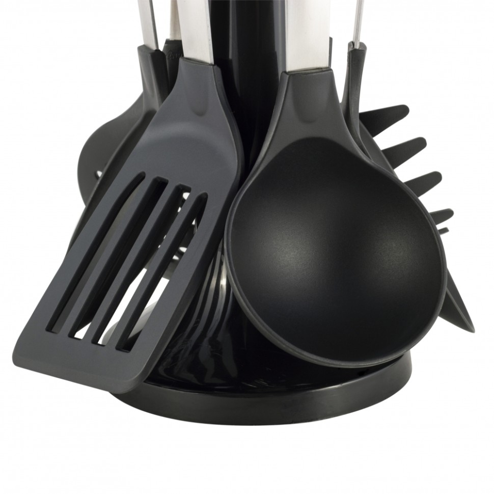 Заводская упаковка нарушена или отсутствует. Товар НОВЫЙ, в полной комплектации. / Набор кухонных принадлежностей из 7ми придметов на крутящейся подставке. Размеры:1) Шумовка 31,7,5х7 см. 2) Половник 31х7,5 см. 3) Лопатка 32х4,8 см. 4) Ложка с прорезями 31х7,5 см. 5) Лопатка с прорезями 31,8,3х9 см. 6) Ложка для спагетти 30х6,5 см.. Количество предметов: 7. Материал: нейлон, рукоятка из нержавейки. Цвет: черный. Устойчивы к высоким температурам до 210℃. Можно мыть в посудомоечной машине, подходит для всех типов поверхностей. Не использовать на открытом огне.