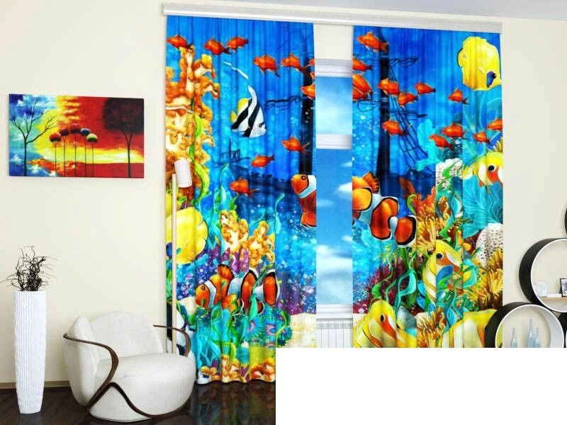 Фотошторы "Цветные рыбки на люверсах", 155*260 см 2шт сатин