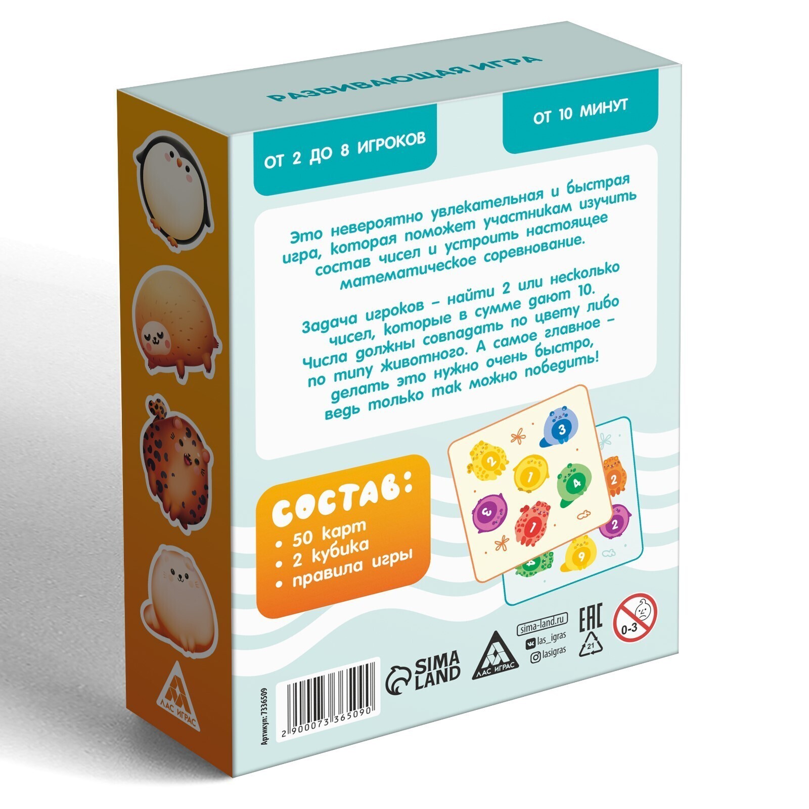 Нужно найти на двух карточках (своей и центральной карте) животных, которые в сумме составят ровно 10. Это может быть одно животное на одной карточке и одно животное на другой карточке; два зверя на одной и один на другой карточке и так далее. При этом животные должны совпадать либо по типу, либо по цвету.