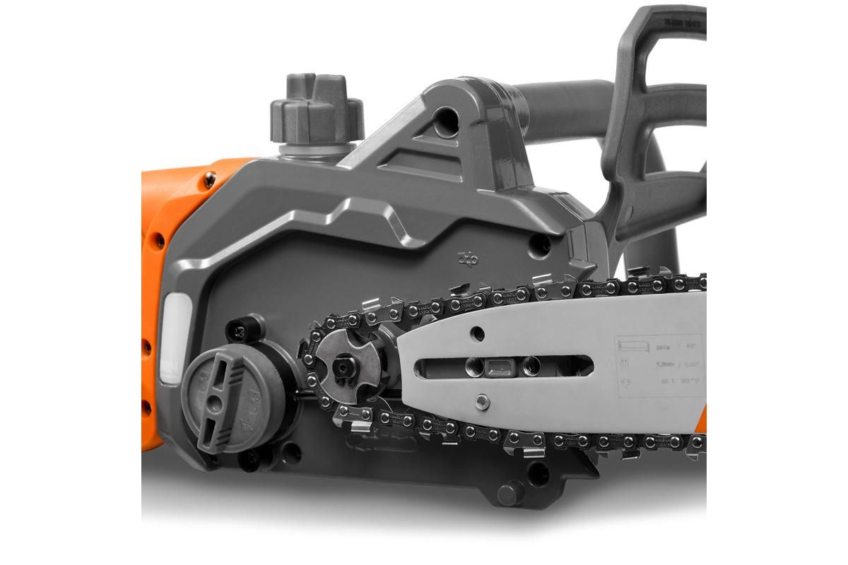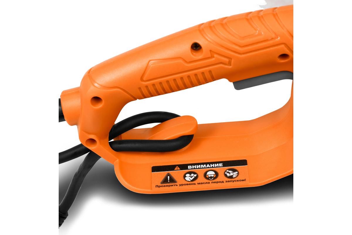 Цепная электрическая пила пригодится для обрезки ветвей кустарников, распиливания бревен, валки деревьев. Надежный электрический двигатель обеспечивает оптимальную работу. Корпус из ударопрочного пластика устойчив к механическим повреждениям. Индикатор уровня цепного масла позволяет поддерживать цепь в смазанном состоянии. Предусмотрена защита от случайного запуска пилы. Модель имеет облегченную регулировку натяжения цепи: фиксация натяжения происходит за счет закручивания гаек при помощи ключа.