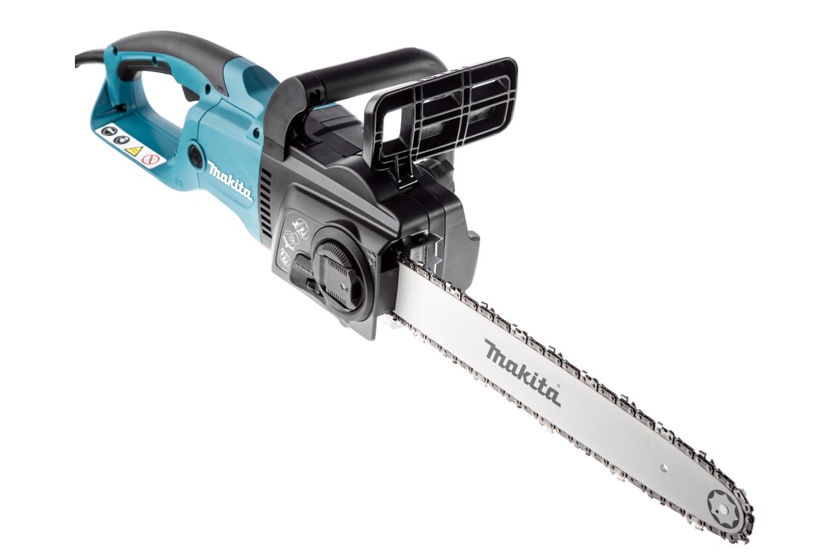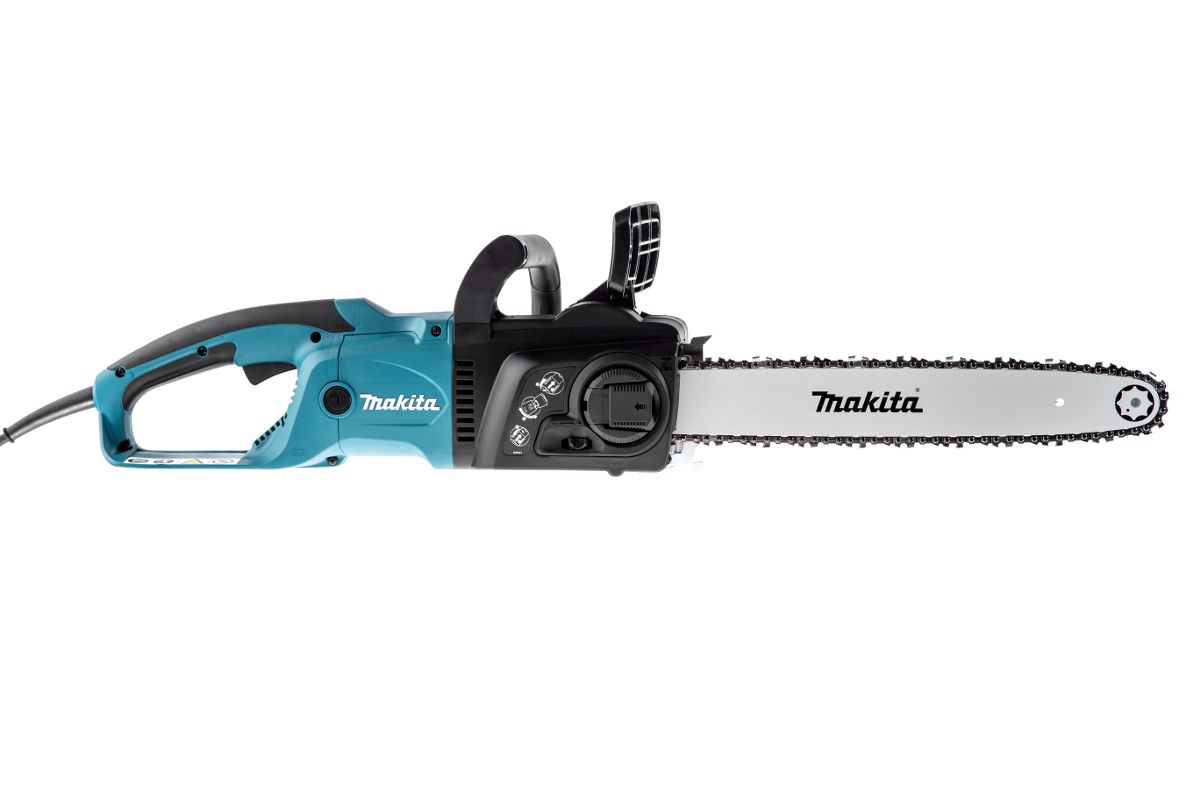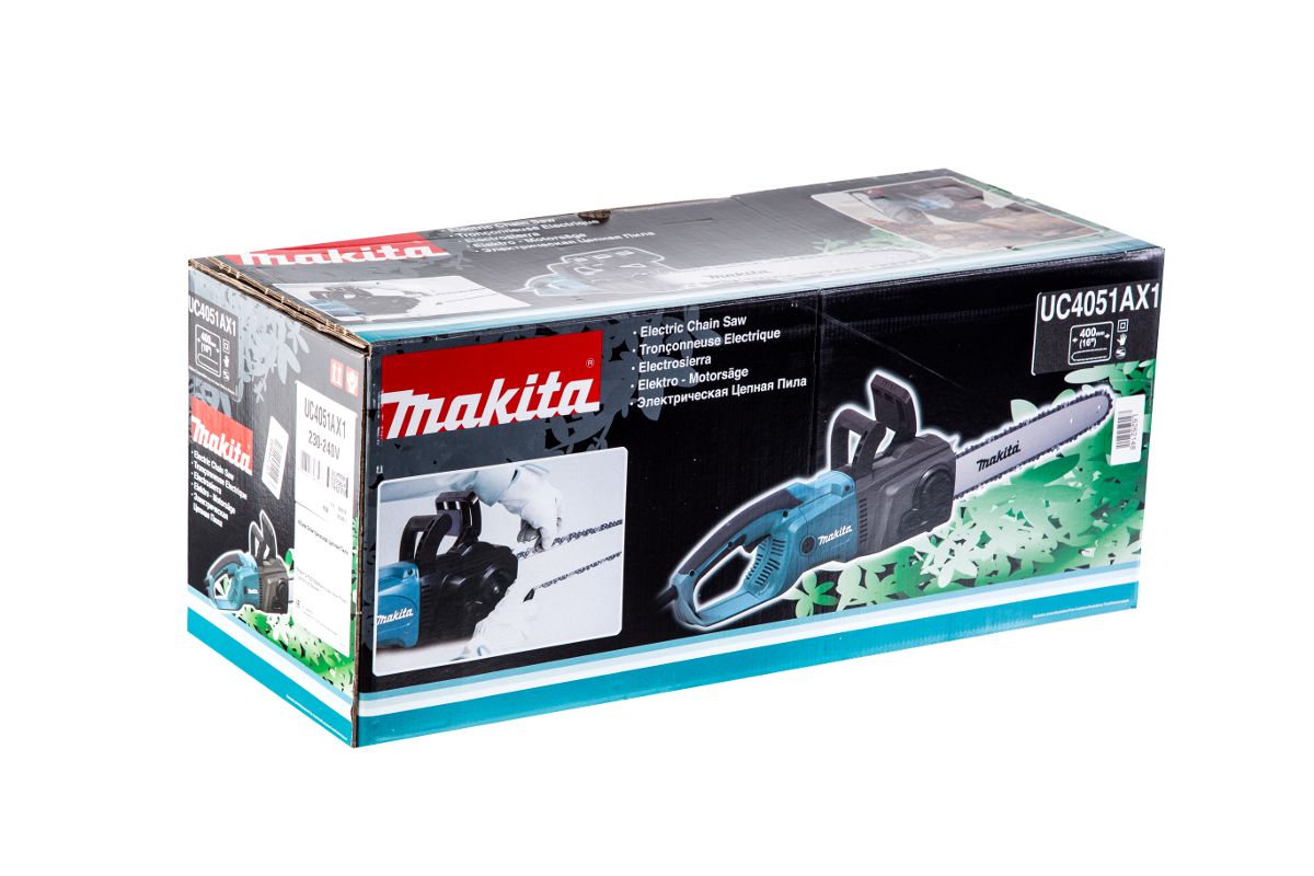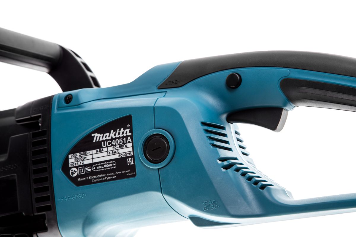 MAKITA UC4051AX1 – сетевая цепная пила. Мощность 2000 Вт, длина шины – 40 см. Подойдёт для заготовки дров, валки деревьев, обрезания сучьев и т.д. Питается от сети 220 В.