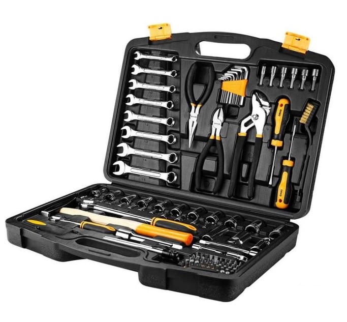 - Комплектация - 8 шт. комбинированные ключи,- 1 шт. бокорезы,- 1 шт. плоскогубцы с длинным носом,- 8 шт. шестигранные ключи,- 1 шт. переставной ключ,- 2 шт. отвертки,- 1 шт. щетка,- 6 шт. бита шестигранная,- 1 шт. быстросменная отвертка с трещоткой,- 1 шт. тестер давления в шинах,- 1 шт. молоток,- 2 шт. трещотка,- 25 шт. головки,- 3 шт. удлинитель,- 2 шт. универсальный шарнир,- 50 шт. биты: SL3,3,4,5,6, PH0,0,1,1,2,2,3,3, PZ0,0,1,1,2,2,3,3, H1.5,1.5,2,2,3,4,4,5,5,5.5,6,6, T10,15,20,25,27,30,35, S0,0,1,1,2,2,3,3
