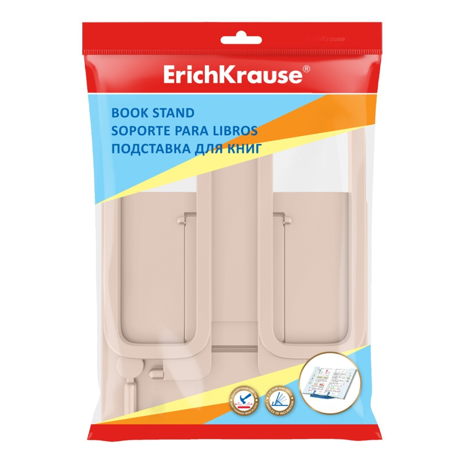 Пластиковая складная подставка с фиксатором для книг. Позволяет расположить книгу под удобным углом наклона (7 углов), тем самым положительно влияя на осанку и зрение ребенка. Держатель, расположенный в нижней части, надежно фиксирует страницы. Ширина подставки - 235 мм, высота спинки - 190 мм.