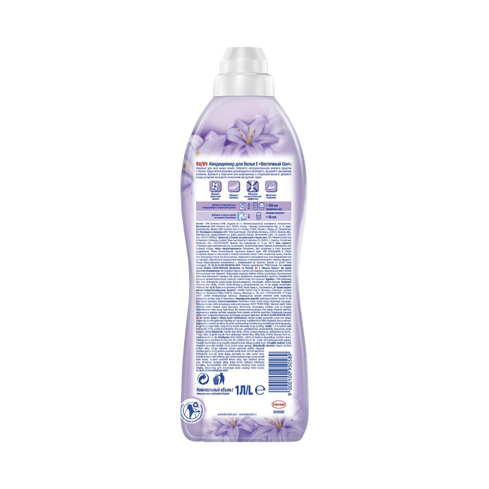 Кондиционер для белья Е Восточный Сон придает мягкость белью. Обладает антистатическим эффектом. Придает приятный аромат. Облегчает глажение. Подходит для всех видов тканей. Не требуется предварительно разбавлять водой. Машинная стирка: добавьте в отделение для кондиционера в стиральной машине. Ручная стирка: добавьте в воду во время последнего полоскания. Дозировать при помощи колпачка.
