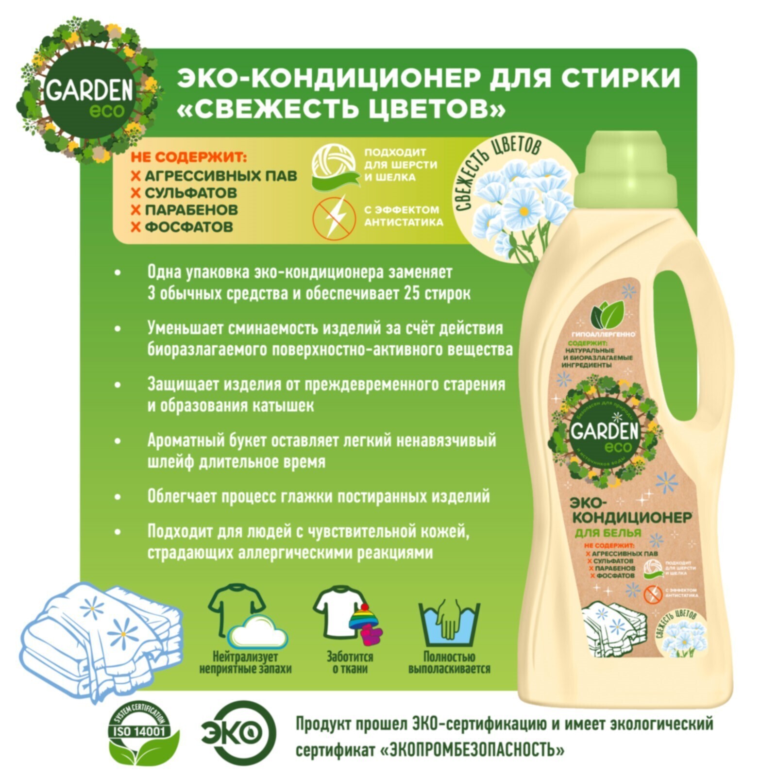 Кондиционер, ополаскиватель для белья Eco Garden безопасен для окружающей среды, при попадании в водоемы или в септики с живыми бактериями – не вредит местной флоре.