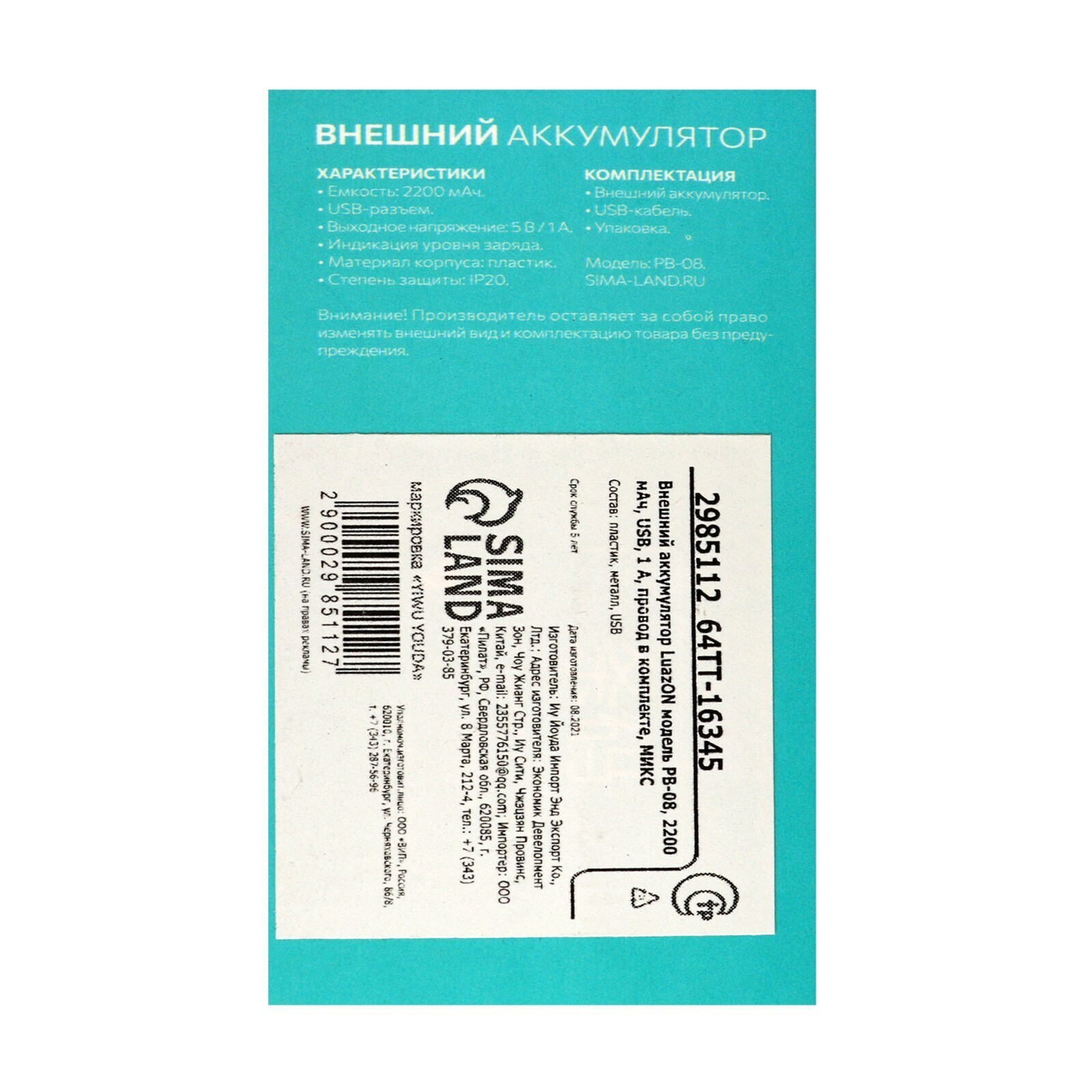 Внешний аккумулятор LuazON PB-08, 2200 мАч, USB, 1 А, провод в комплекте, МИКС