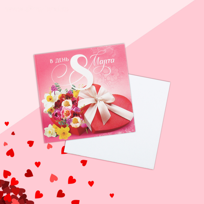 Открытка мини «В день 8 марта», цветы в коробке, 7 × 7 см