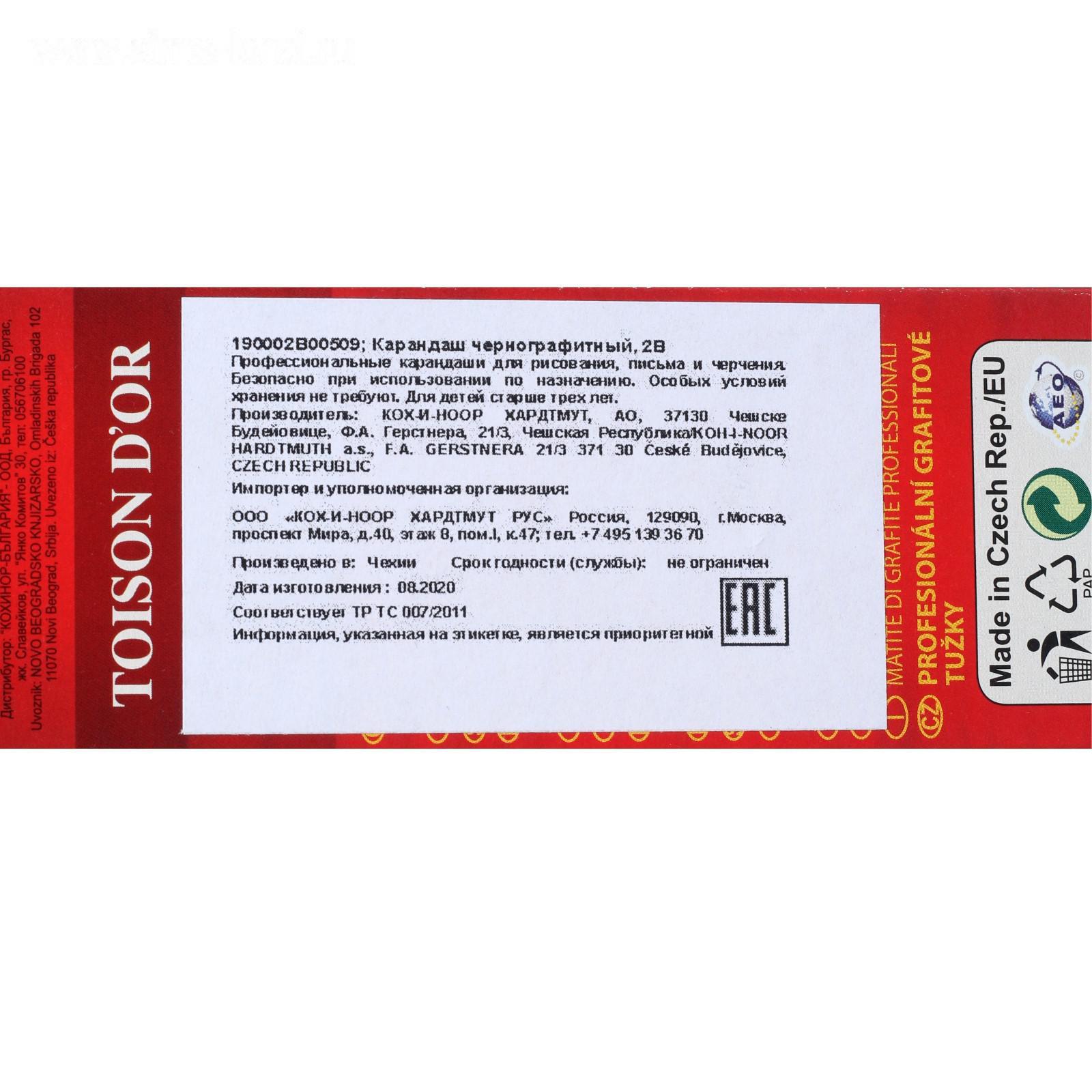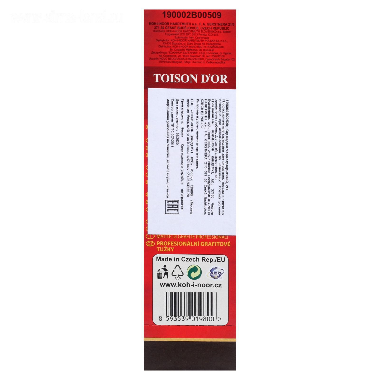 Карандаш профессиональный чернографитный 2.0 мм, Koh-I-Noor 1900 2В, L=175 мм