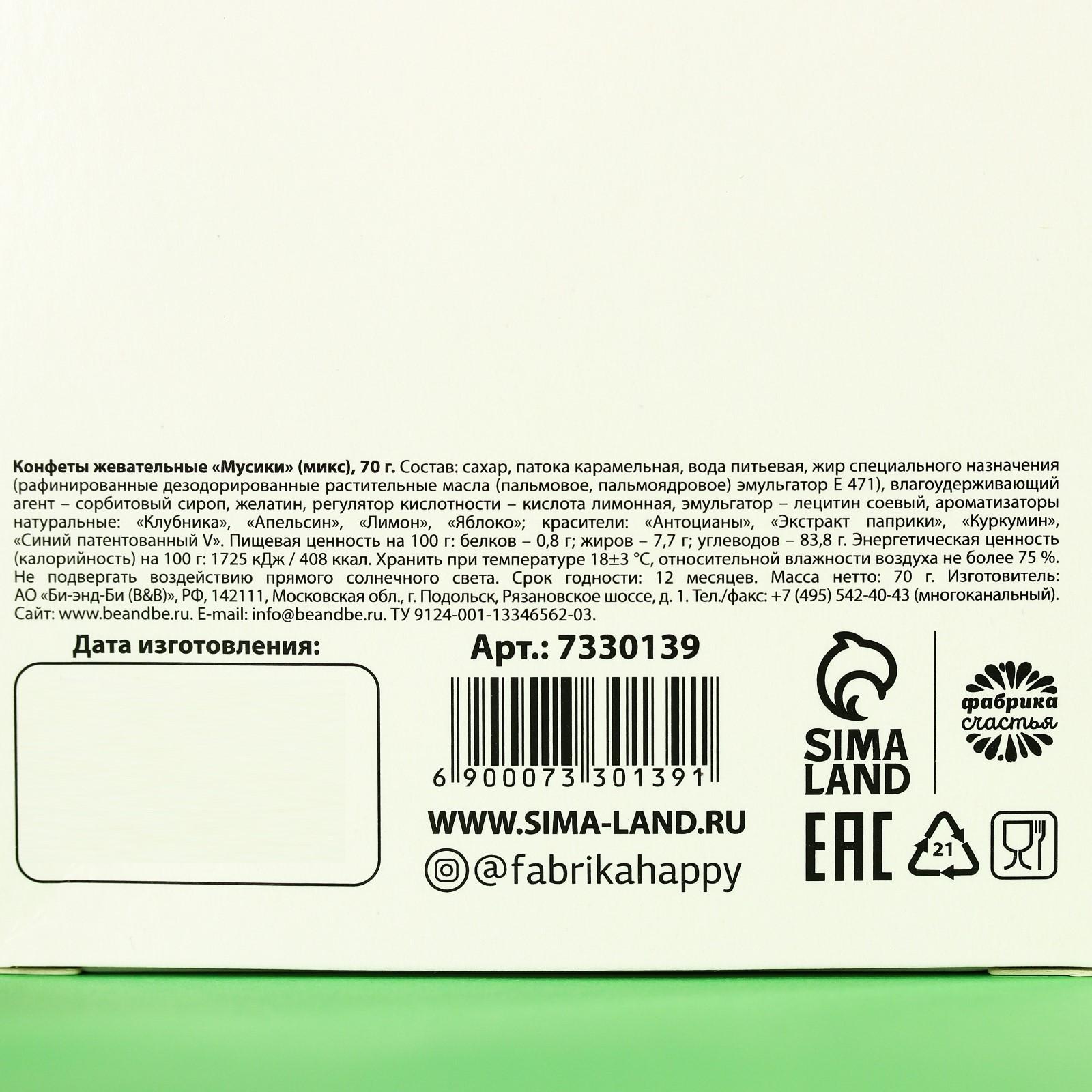 Состав: сахар, патока карамельная, вода питьевая, жир специального назначения (рафинированные дезодорированные растительные масла (пальмовое, пальмоядровое) эмульгатор Е 471), влагоудерживающий агент – сорбитовый сироп, желатин, регулятор кислотности – кислота лимонная, эмульгатор – лецитин соевый, ароматизаторы натуральные: «Клубника», «Апельсин», «Лимон», «Яблоко»; красители: «Антоцианы», «Экстракт паприки», «Куркумин», «Синий патентованный V».