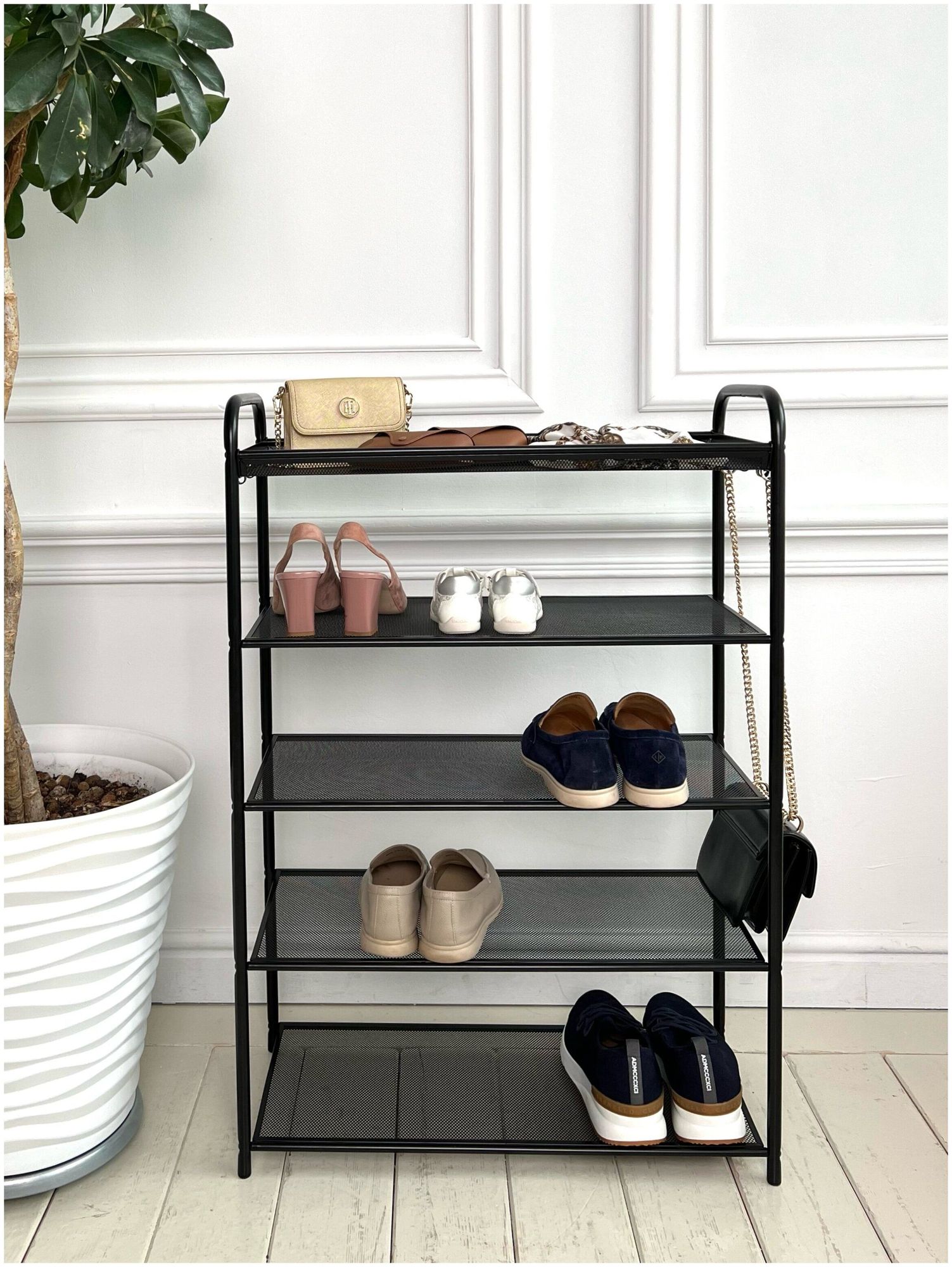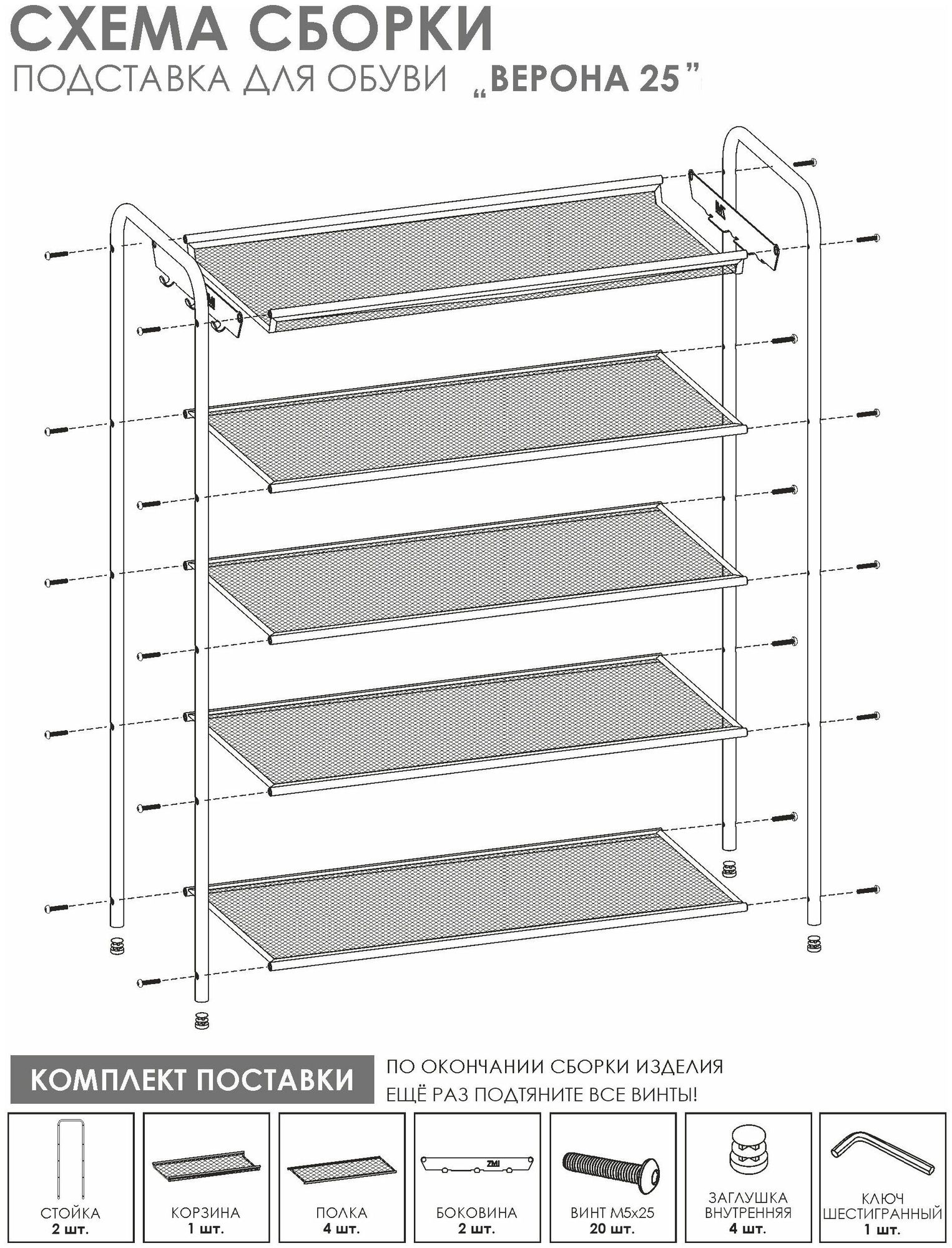 Стильная обувница «Верона 25» от российского производителя «ЗМИ» создана для компактного хранения обуви в доме или офисе.. Предлагаемые цветовые решения позволят встроить этажерку для обуви в любой интерьер. Долговечная, благодаря каркасу и полкам из стали. Четыре полки вместят до 12 пар обуви, а продуманные расстояния между ними позволят разместить как летнюю, так и зимнюю обувь. Каждая полка выдерживает нагрузку до 8 кг. Верхняя корзина позволяет разместить разные мелочи, а боковые крючки – ложку для обуви и ключи. Подставку для обуви «Верона 25» можно использовать не только для хранения обуви, но и как стеллаж для прочих предметов. Собирается легко, благодаря пошаговой инструкции. Все инструменты для сборки уже в комплекте. Обувница в картонной цветной упаковке с удобной ручкой – легко донести от пункта выдачи до дома. Идеальный подарок для тех, кто ценит порядок в доме.