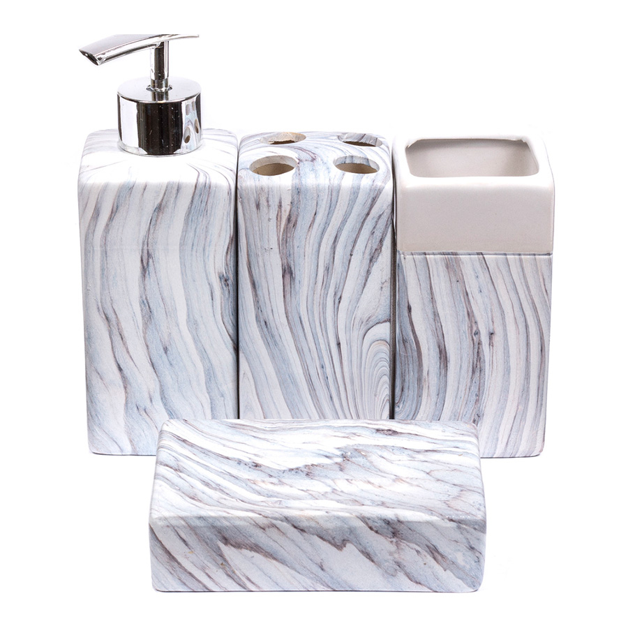 Набор для ванны керамический ''Мрамор'' состоит из 4 предметов: дозатор для жидкого мыла, подставка для зубных щеток, стакан, подставка для мыла. Стильный и неброский набор отличное решение для Вашей ванной комнаты.